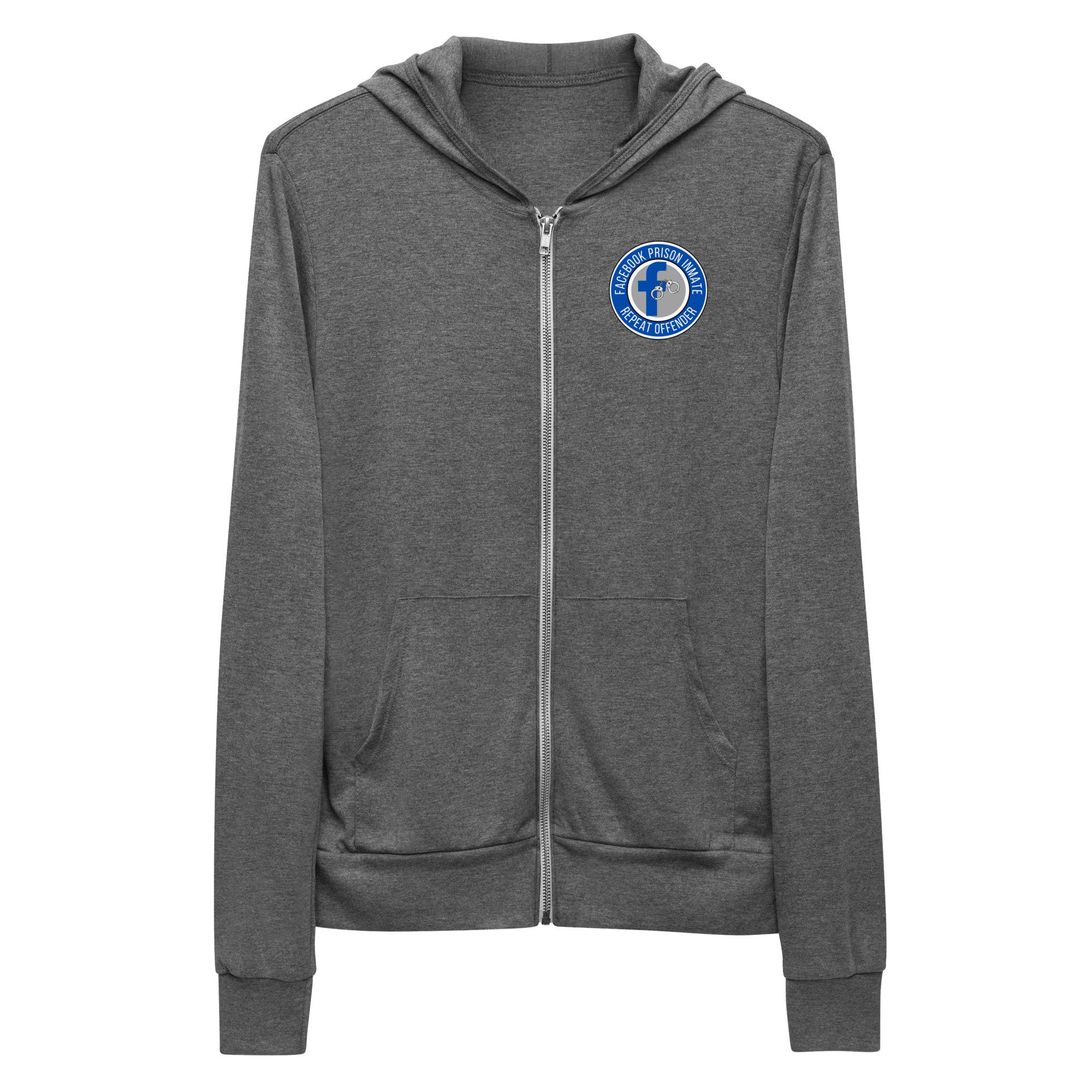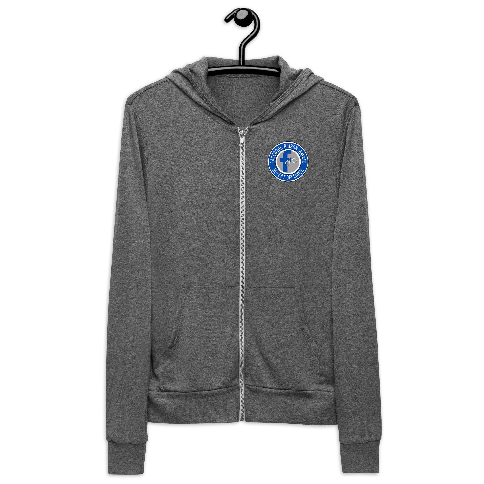 This is a comfy zip hoodie that features our exclusive FB Jail circular badge design. Relax in style while you serve your time in FB Jail. It's the perfect git for your opinionated friend, family member, or work colleague.