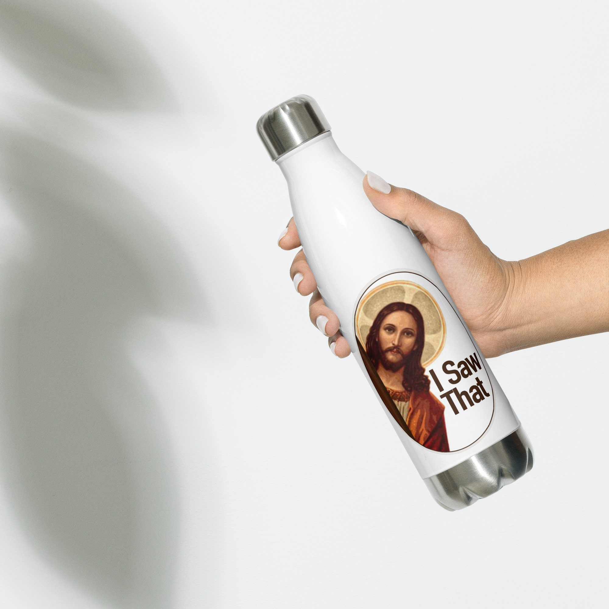 Here’s a water bottle featuring my version of a popular meme of Jesus peeking around a corner and saying, “I saw that.”