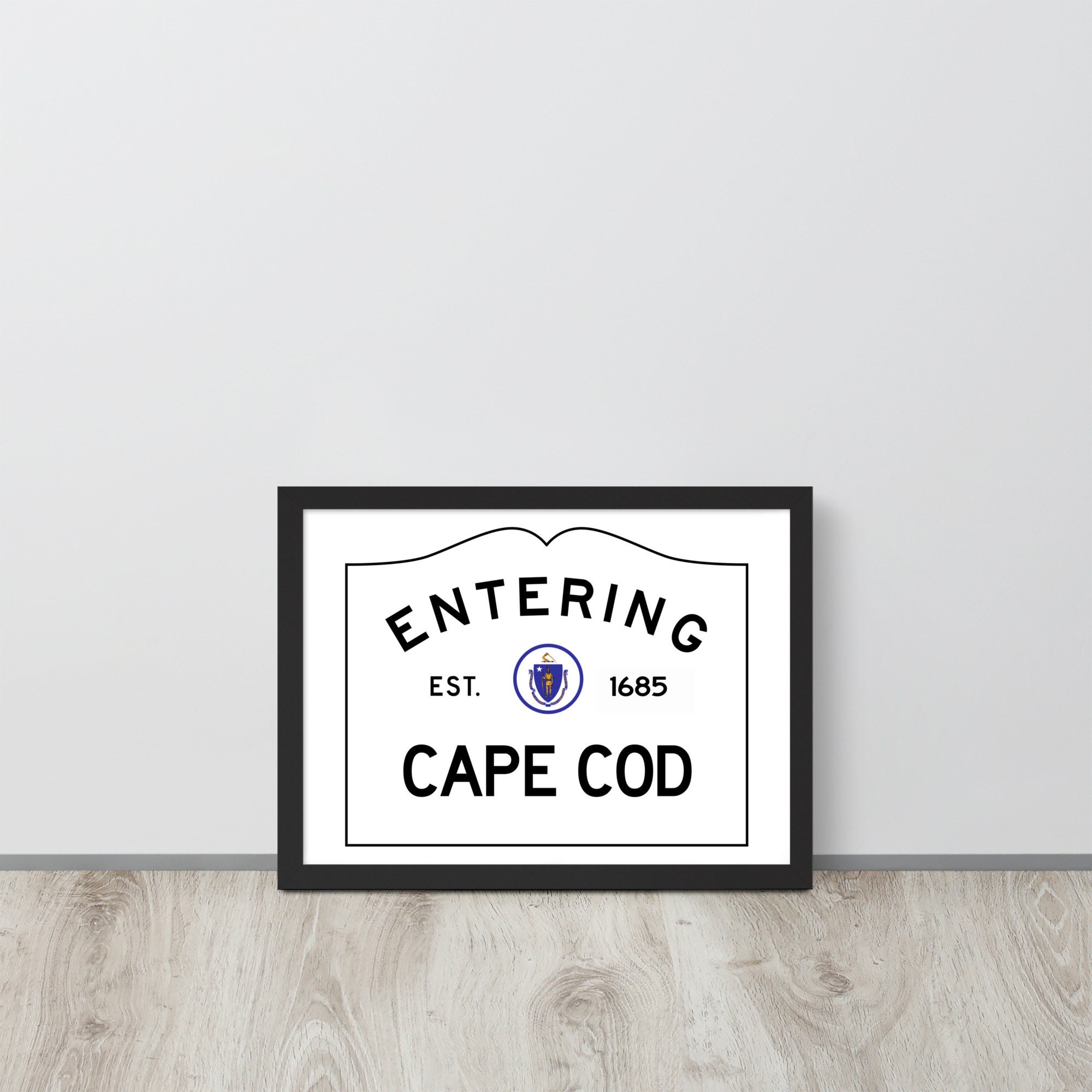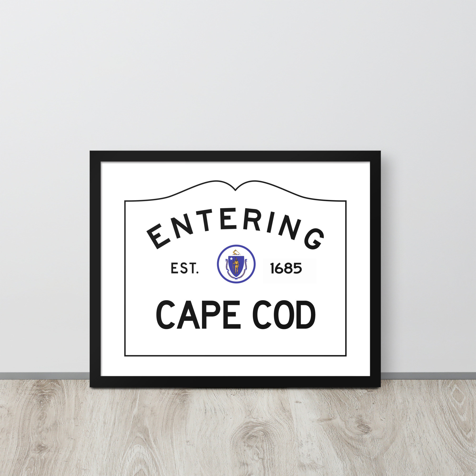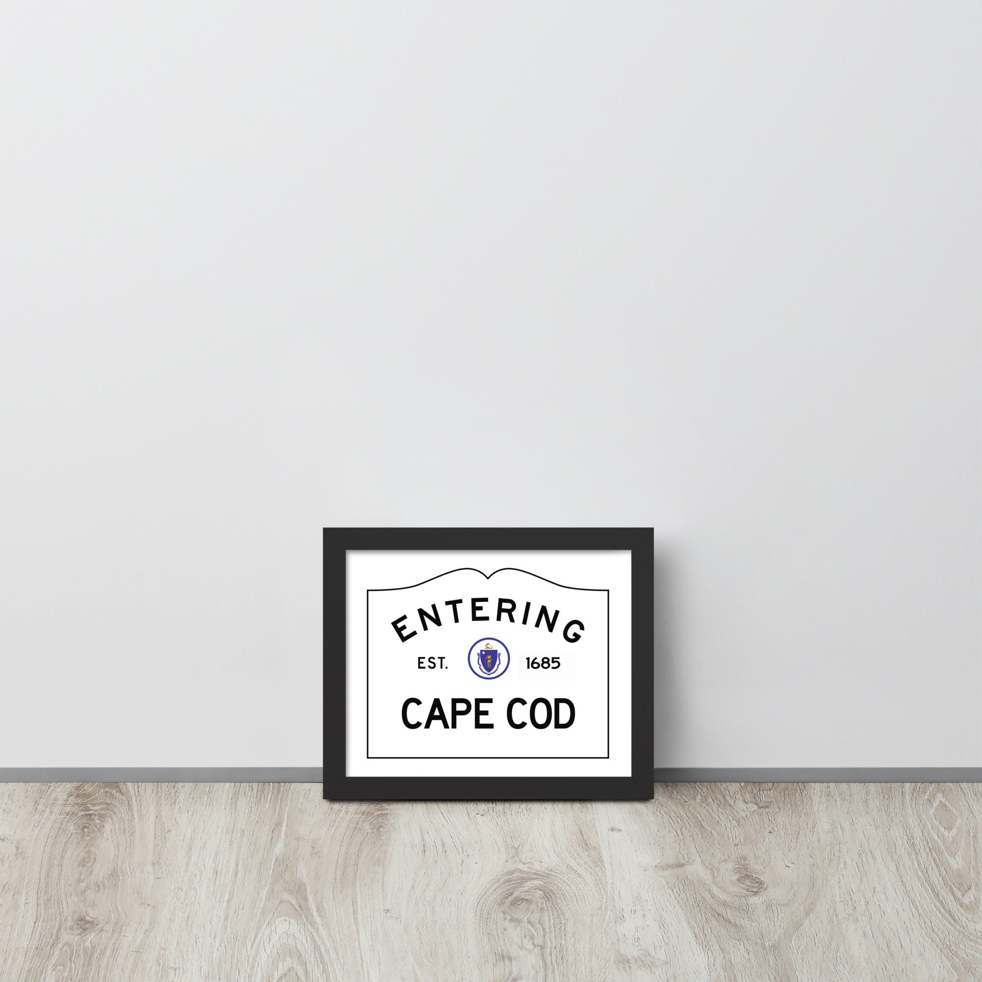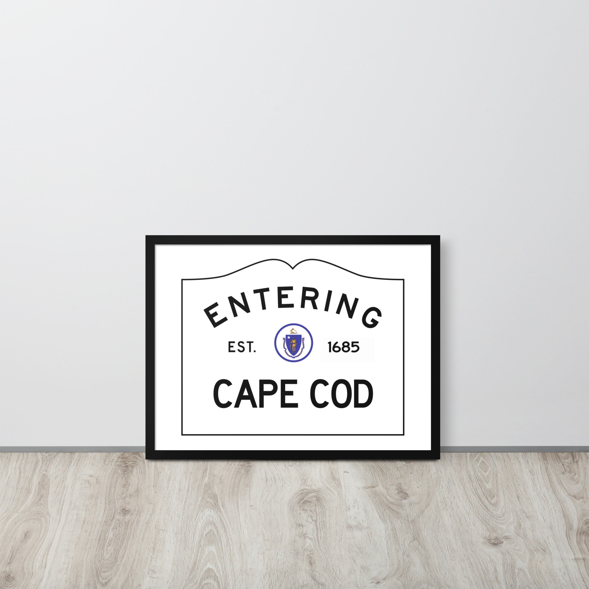 Make a statement in any room with this framed poster featuring my version of the Entering Cape Cod town sign at the border of Cape Cod, Massachusetts. It is printed on high-quality paper, with a partly glossy, partly matte finish.