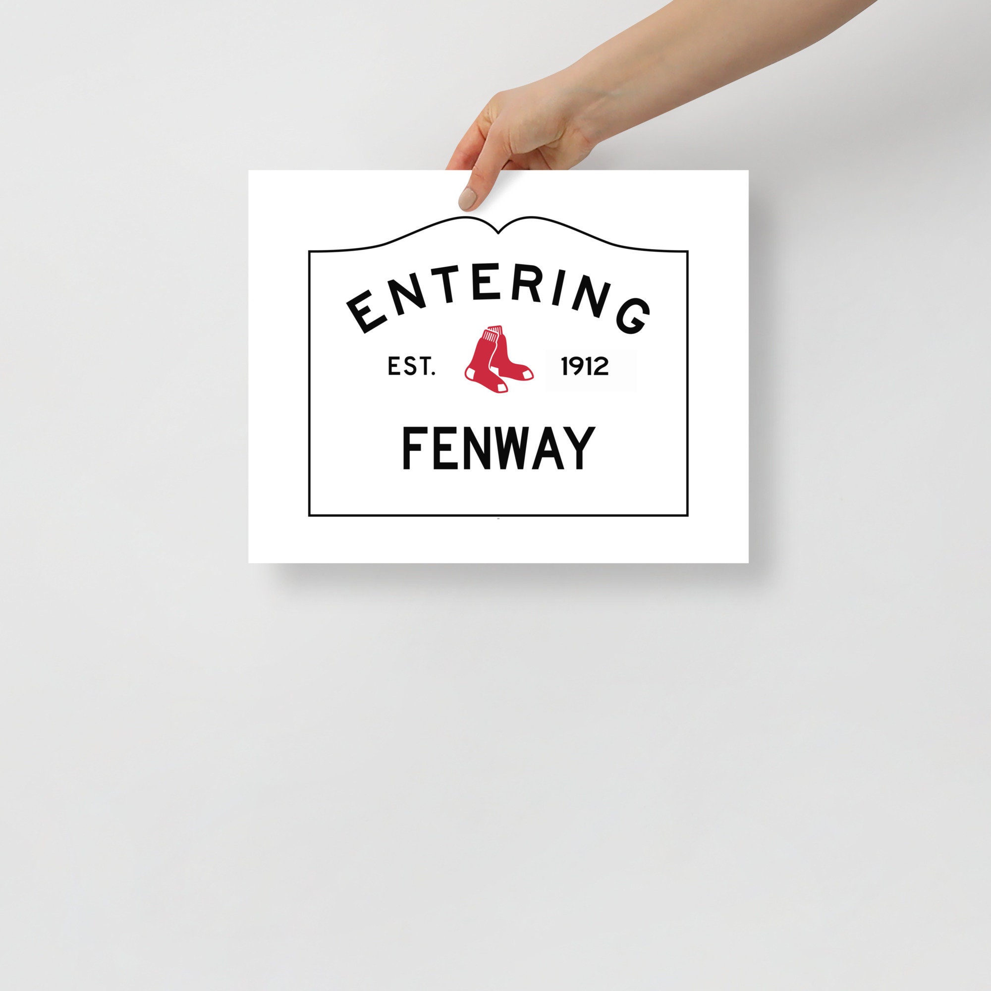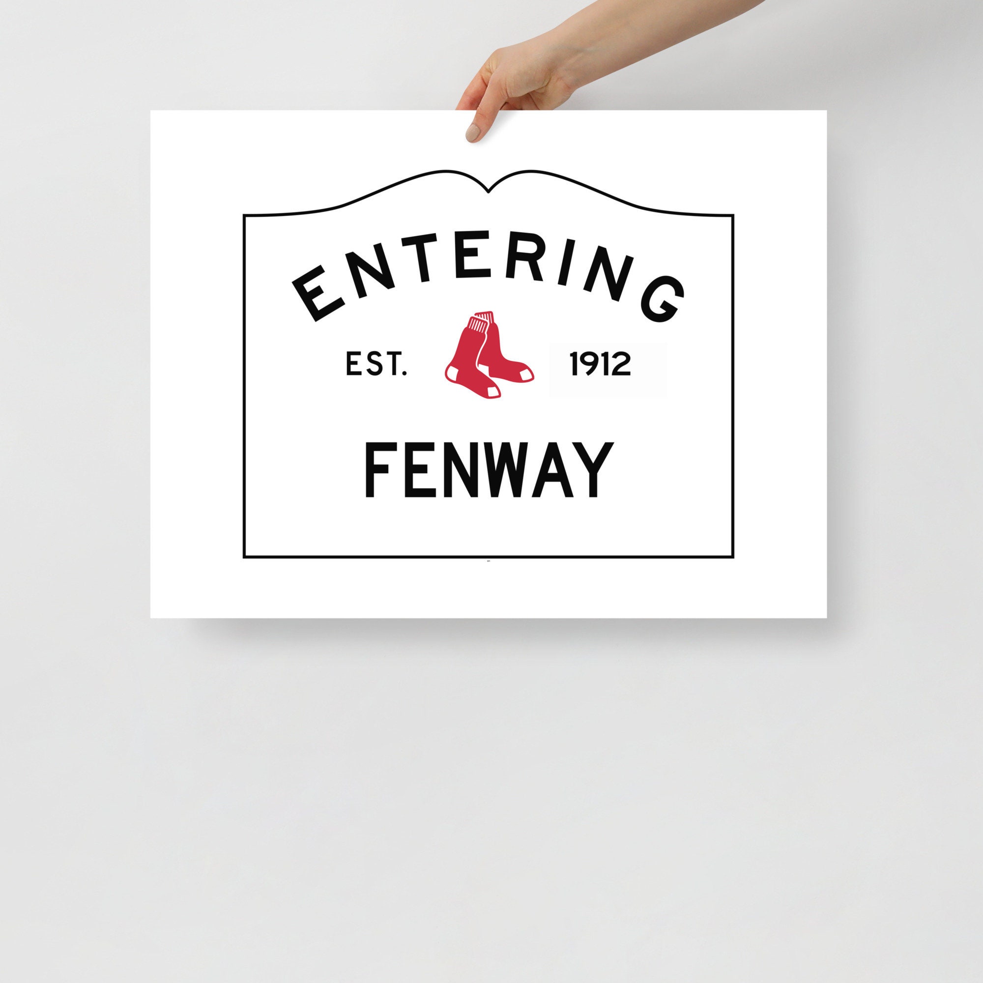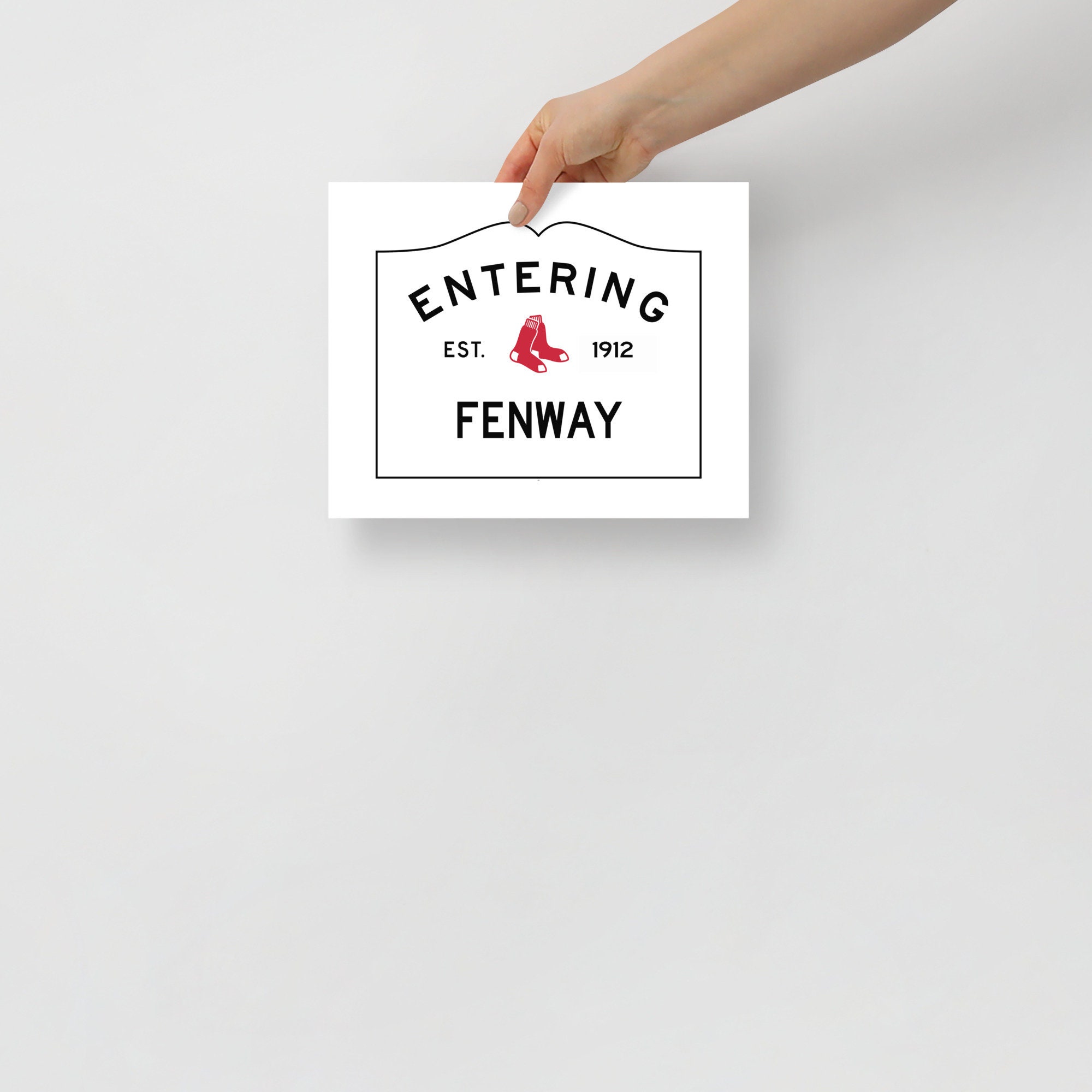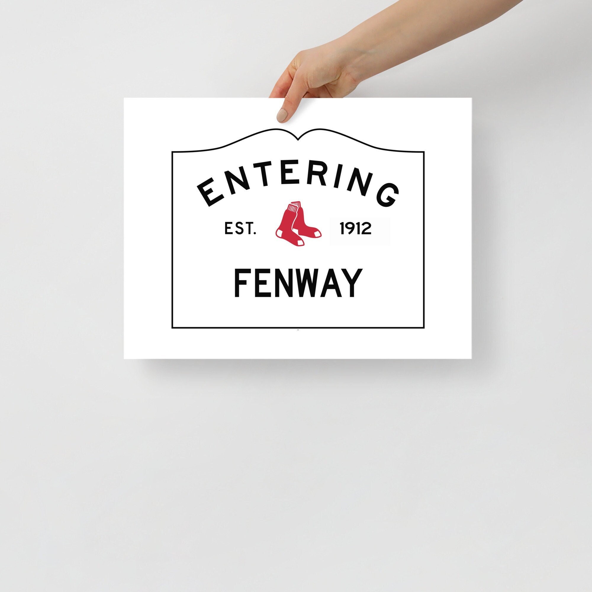 It features my exclusive design that combines Fenway Park and a pair of red sox with the standard Massachusetts town sign design. The perfect gift for the Red Sox fan in your life, it says, "Entering Fenway" and "EST 1912," which was when the park was built.