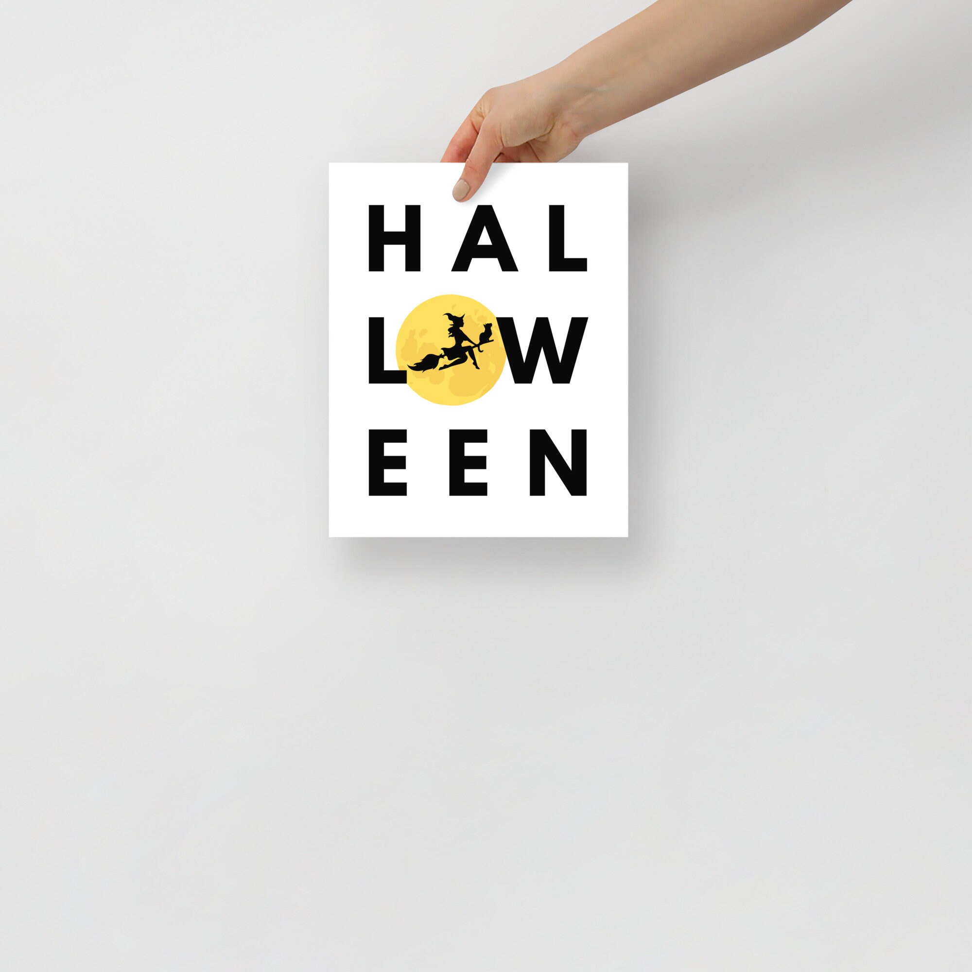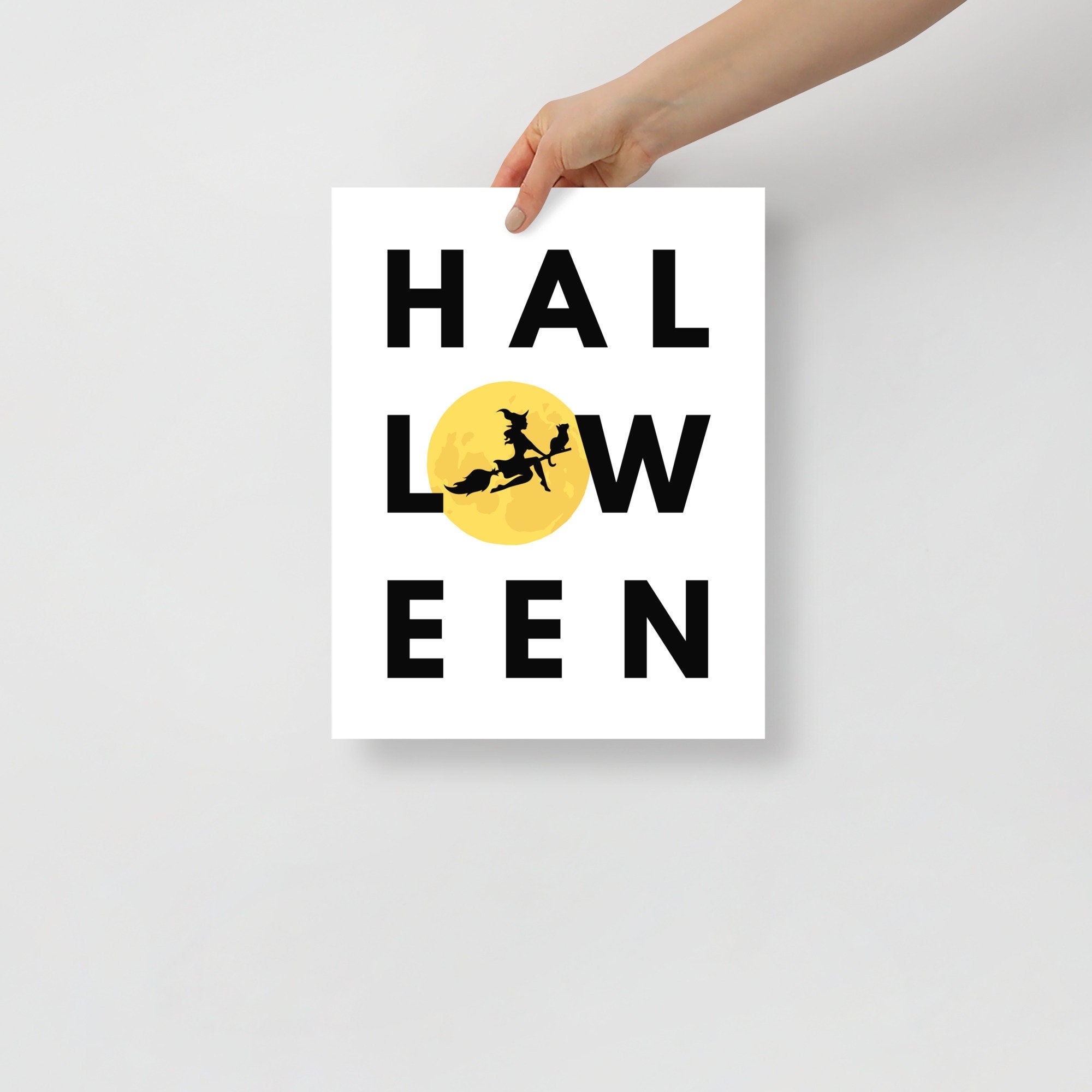 This artwork features a bold black typeface of the word "Halloween" with a full moon in place of the "o." A witch and her familiar (a black cat) fly across the moon on a broom in silhouette. It's a fun, not-so-spooky decor option for October and Halloween.
