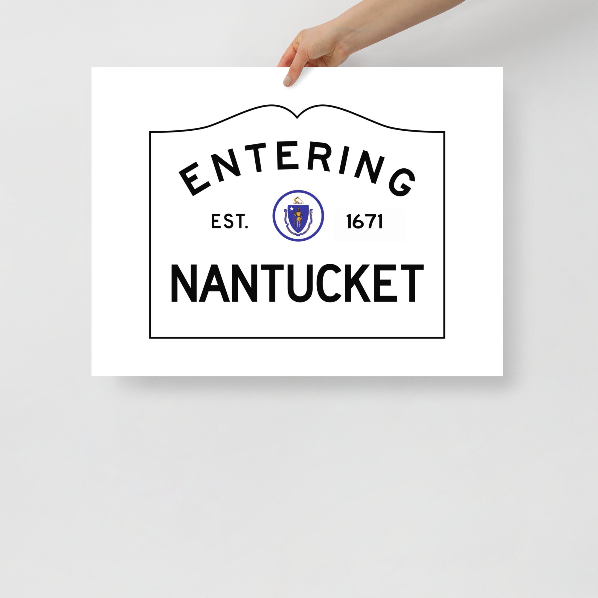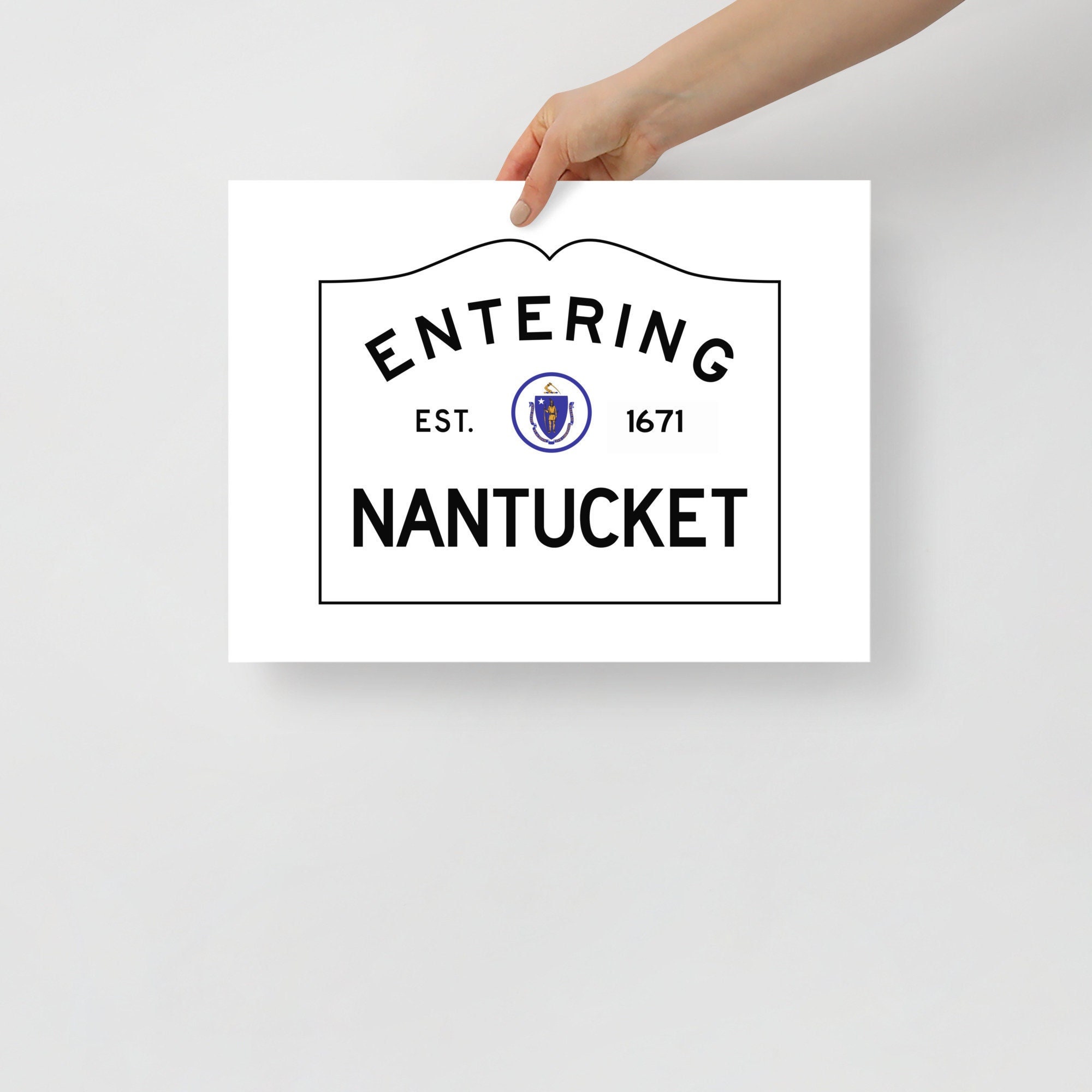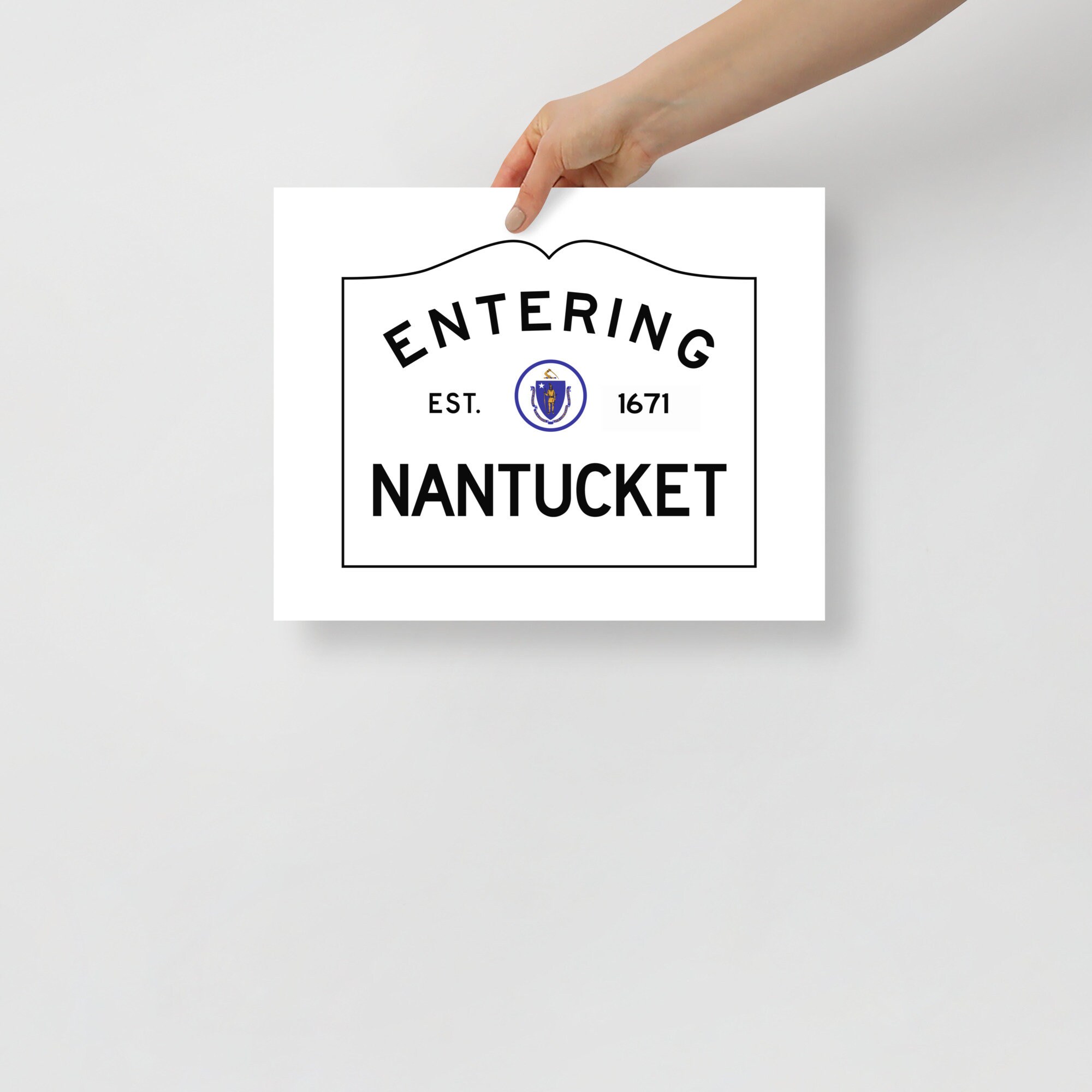 This print is a minimal and chic way to elevate your space. The artwork stands out from any angle as the matte museum-quality paper diffuses the light. It features my design of an Entering Nantucket town sign as it would exist at the border of Nantucket, Massachusetts.