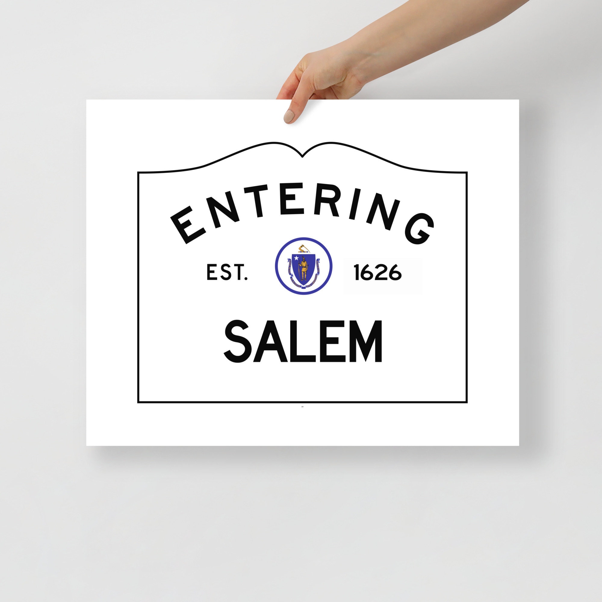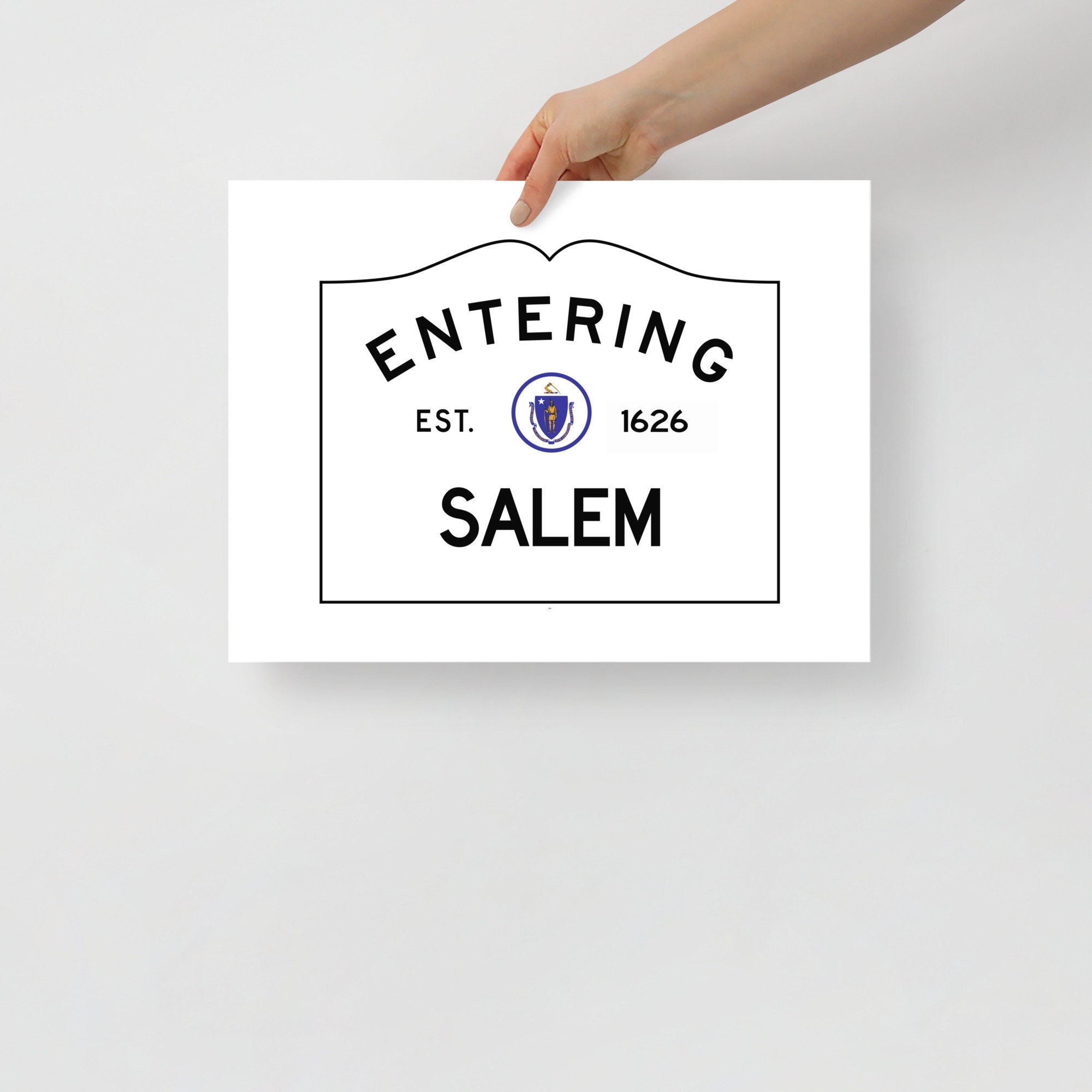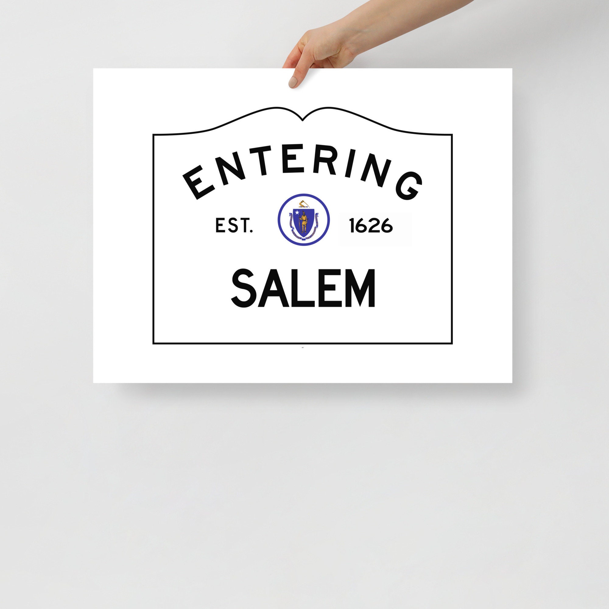 This print is a minimal and chic way to elevate your space. The artwork stands out from any angle as the matte museum-quality paper diffuses the light. It features my version of the Entering Salem town sign at the border of Salem, Massachusetts with a silhouette of a witch flying in front of the moon in the center.