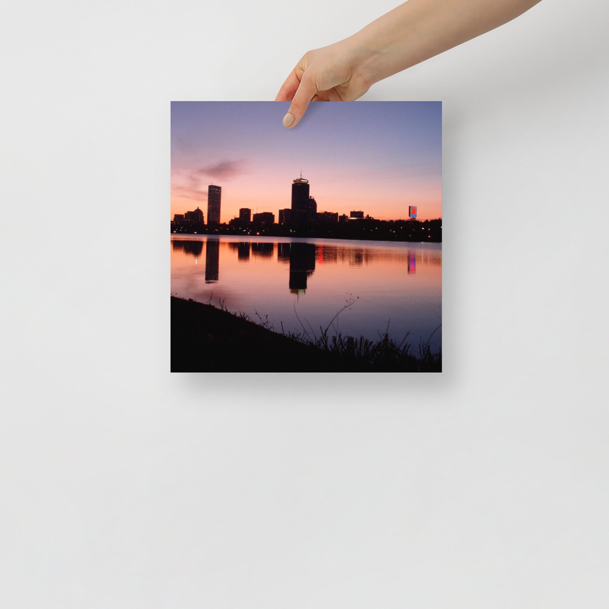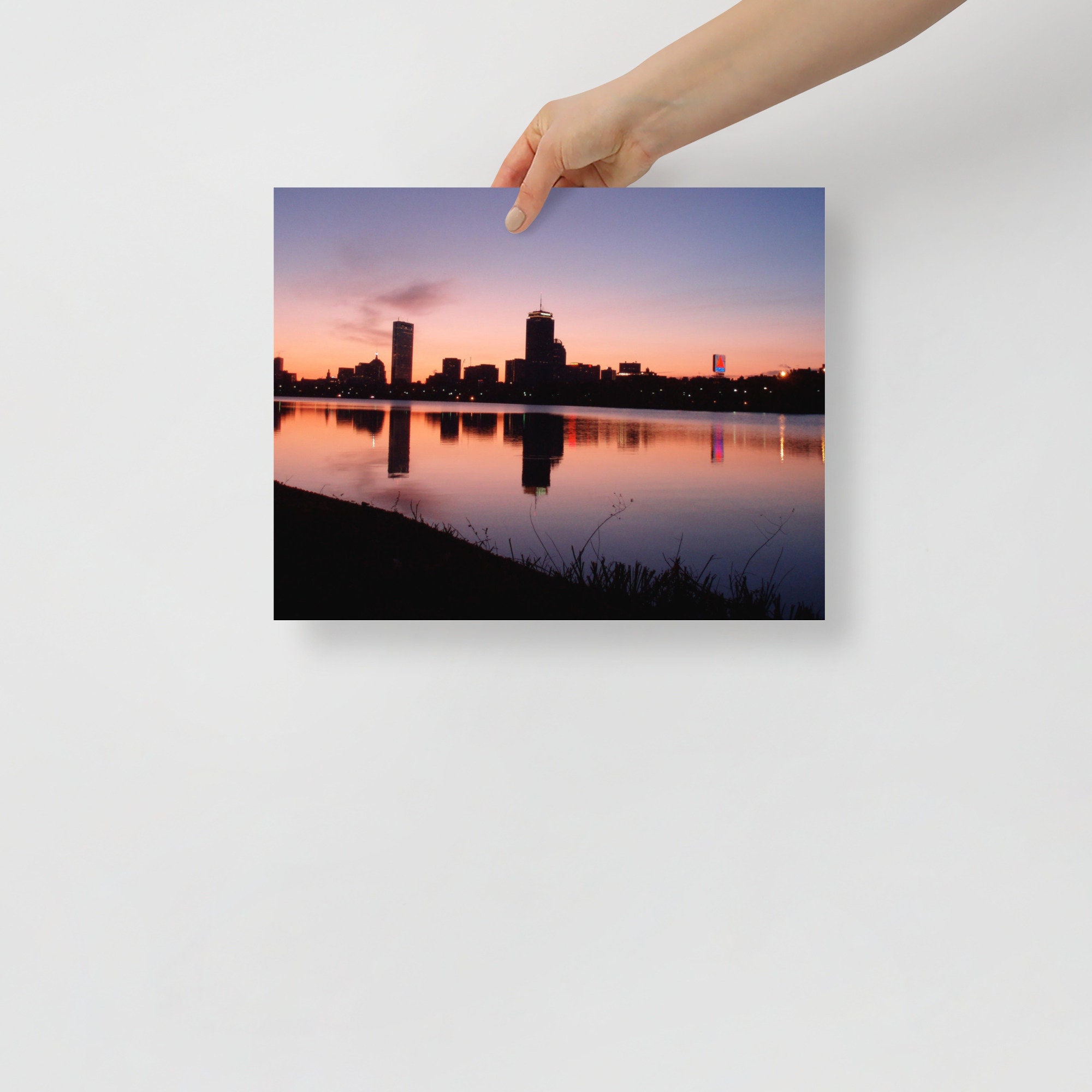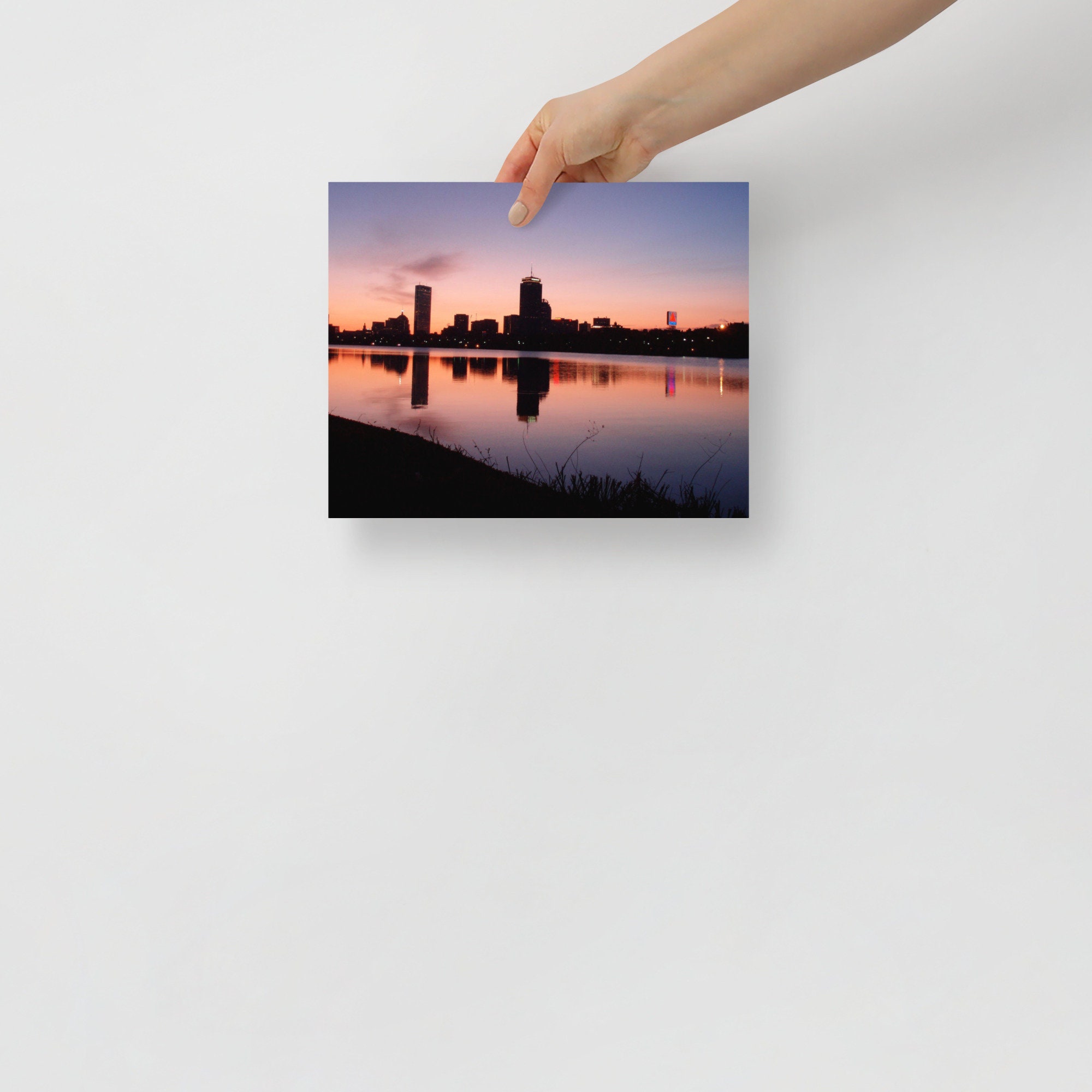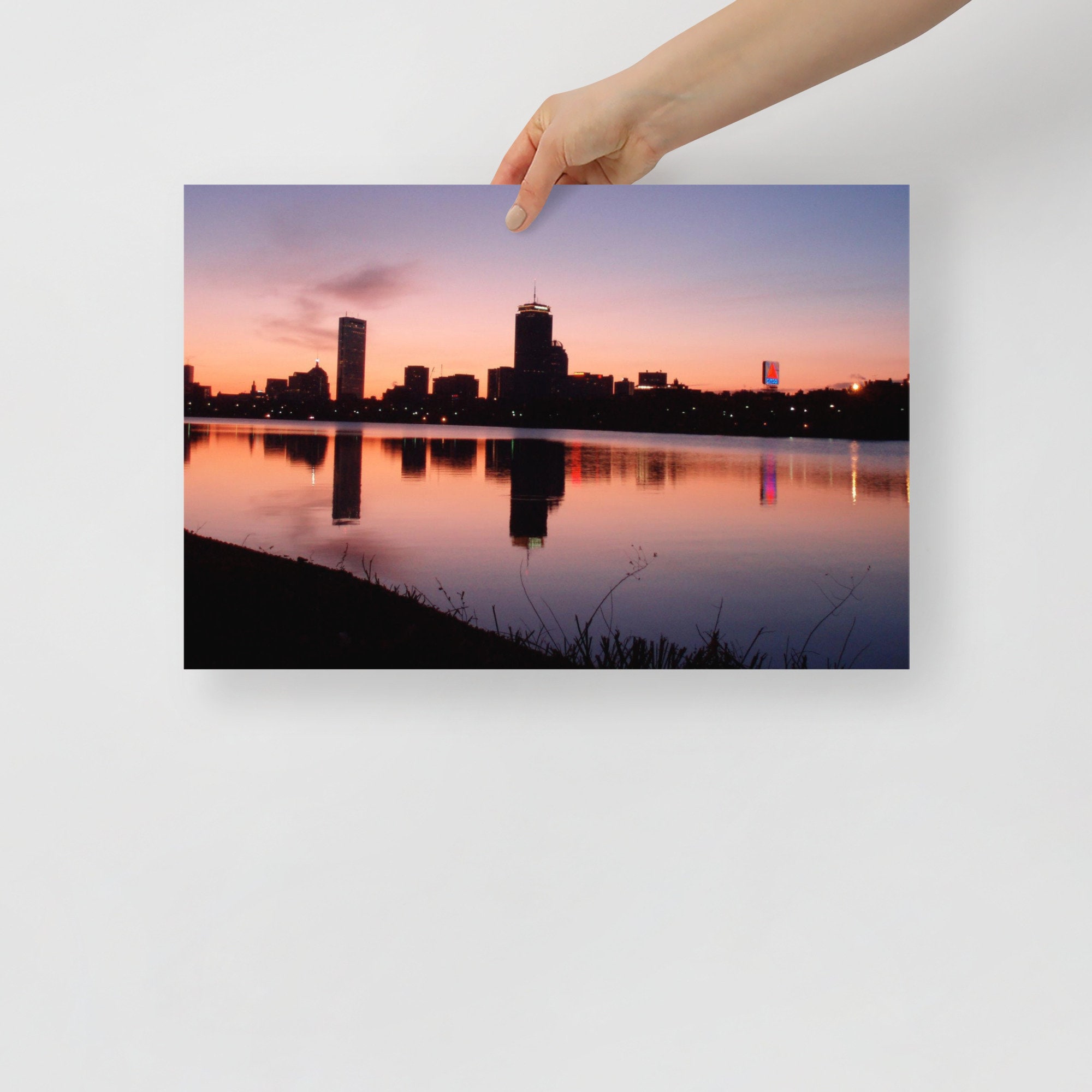 This photograph, taken from the shore of the Charles River in the early morning hours of a crisp fall day in 2006, features a silhouette of the Boston skyline (including the famous Citco sign) against a sky that shifts from the deep blue of night to the warm pinkish orange of dawn. The image is reflected perfectly upon the mirror-like Charles River.