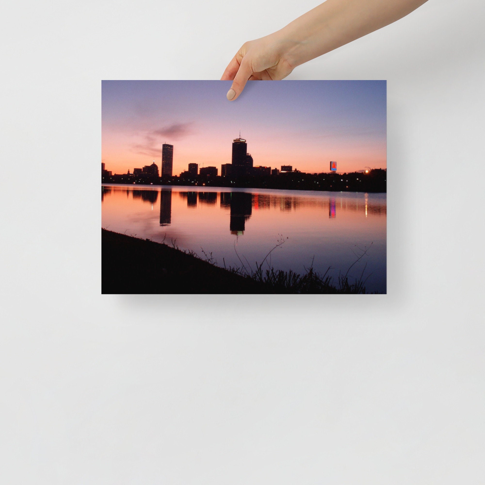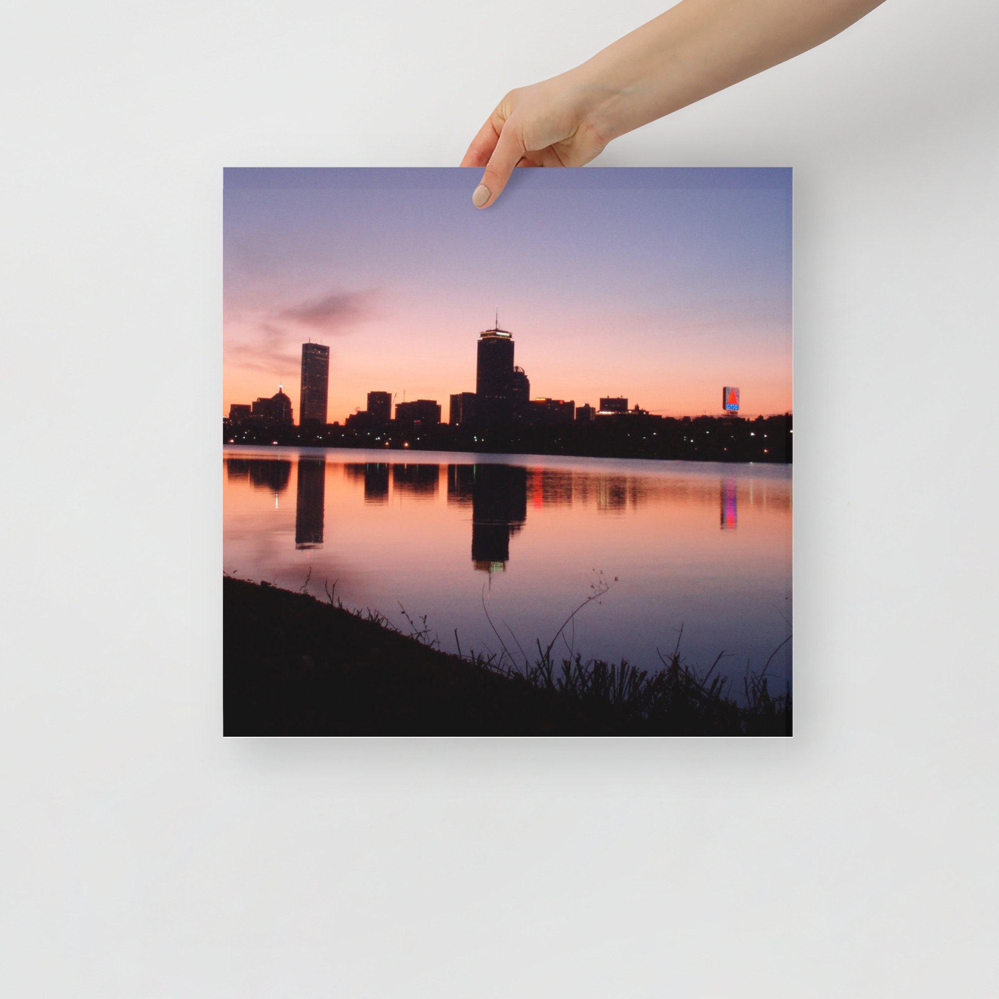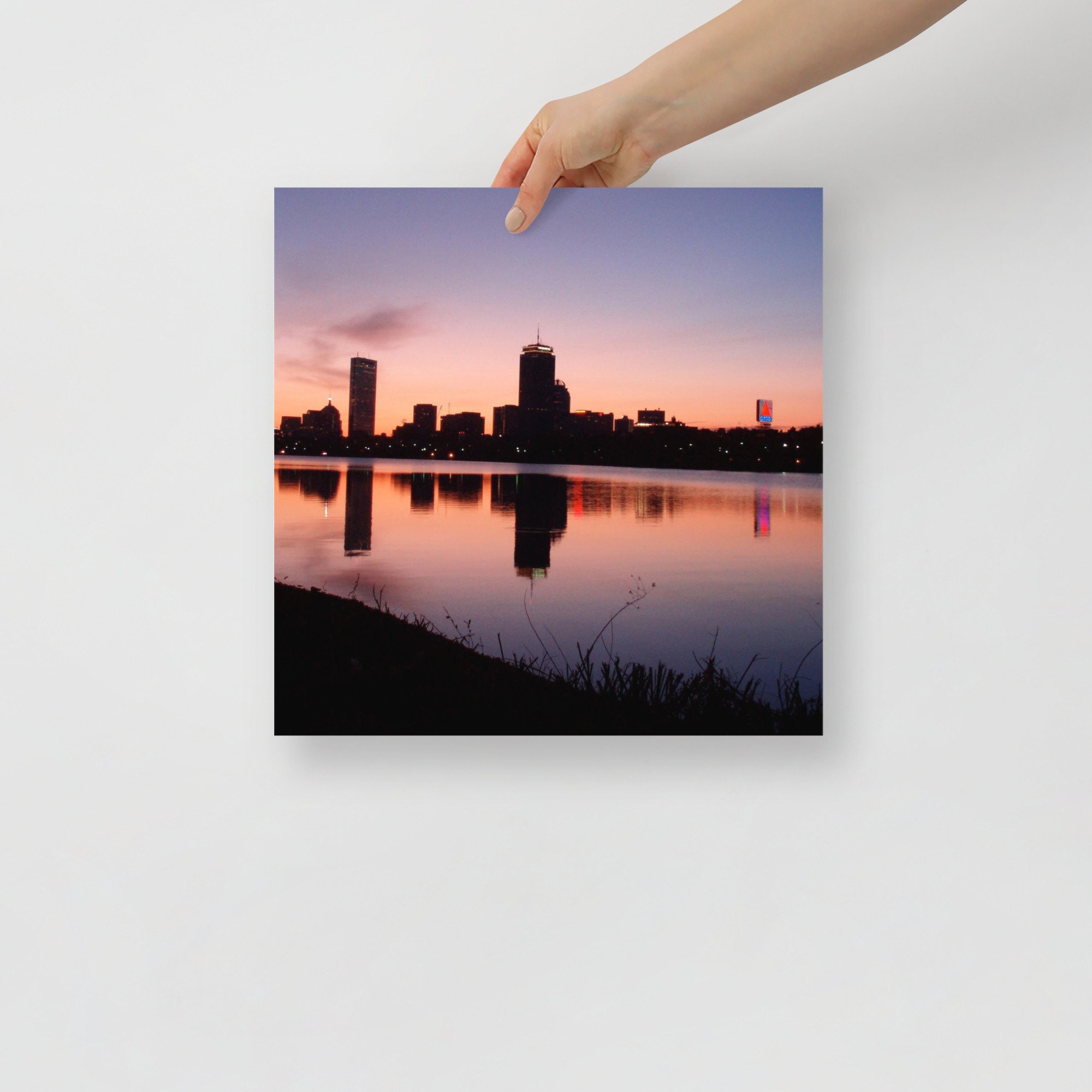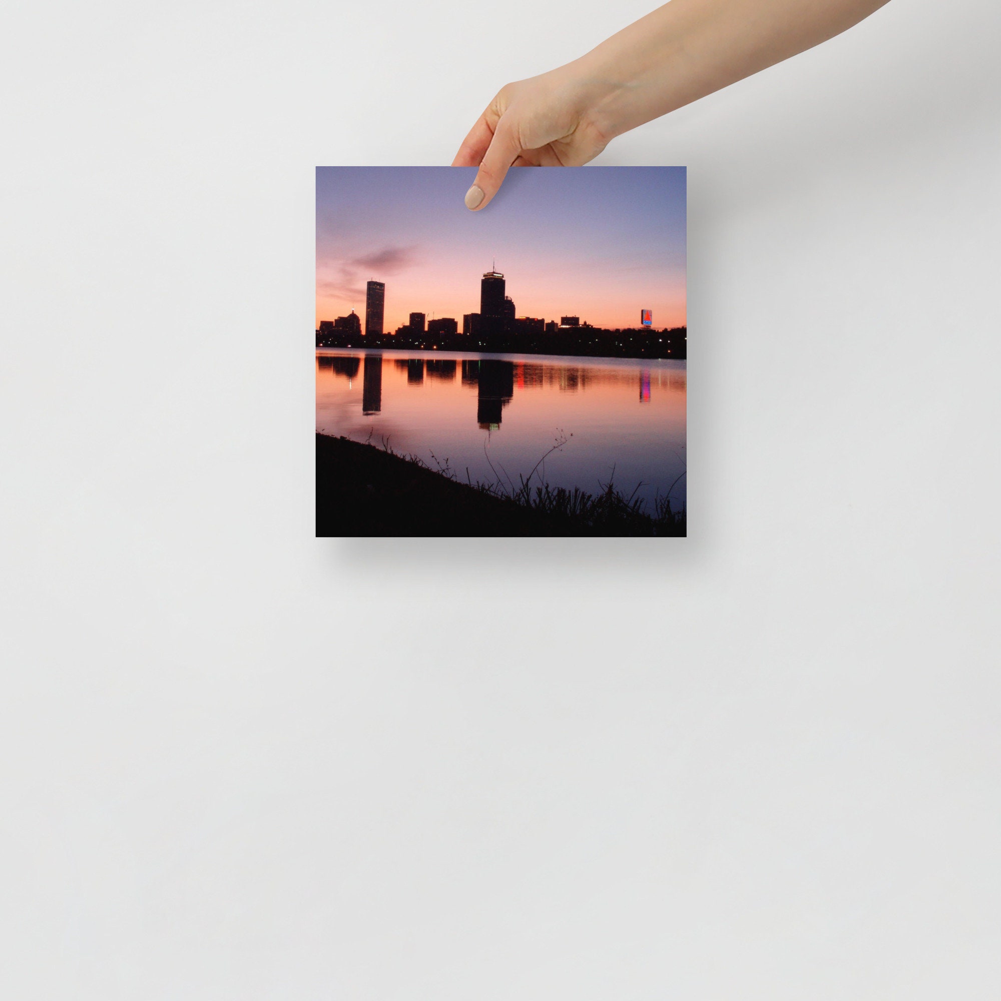 This photograph, taken from the shore of the Charles River in the early morning hours of a crisp fall day in 2006, features a silhouette of the Boston skyline (including the famous Citco sign) against a sky that shifts from the deep blue of night to the warm pinkish orange of dawn. The image is reflected perfectly upon the mirror-like Charles River.