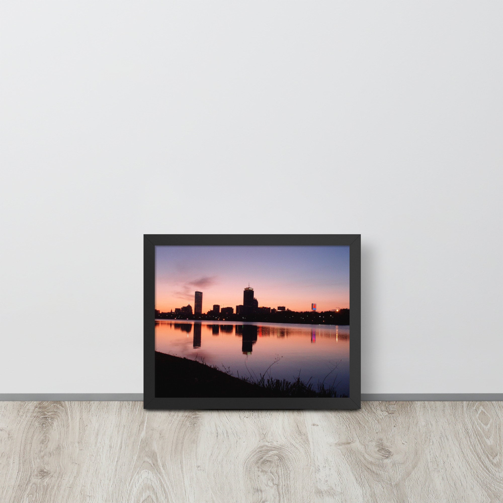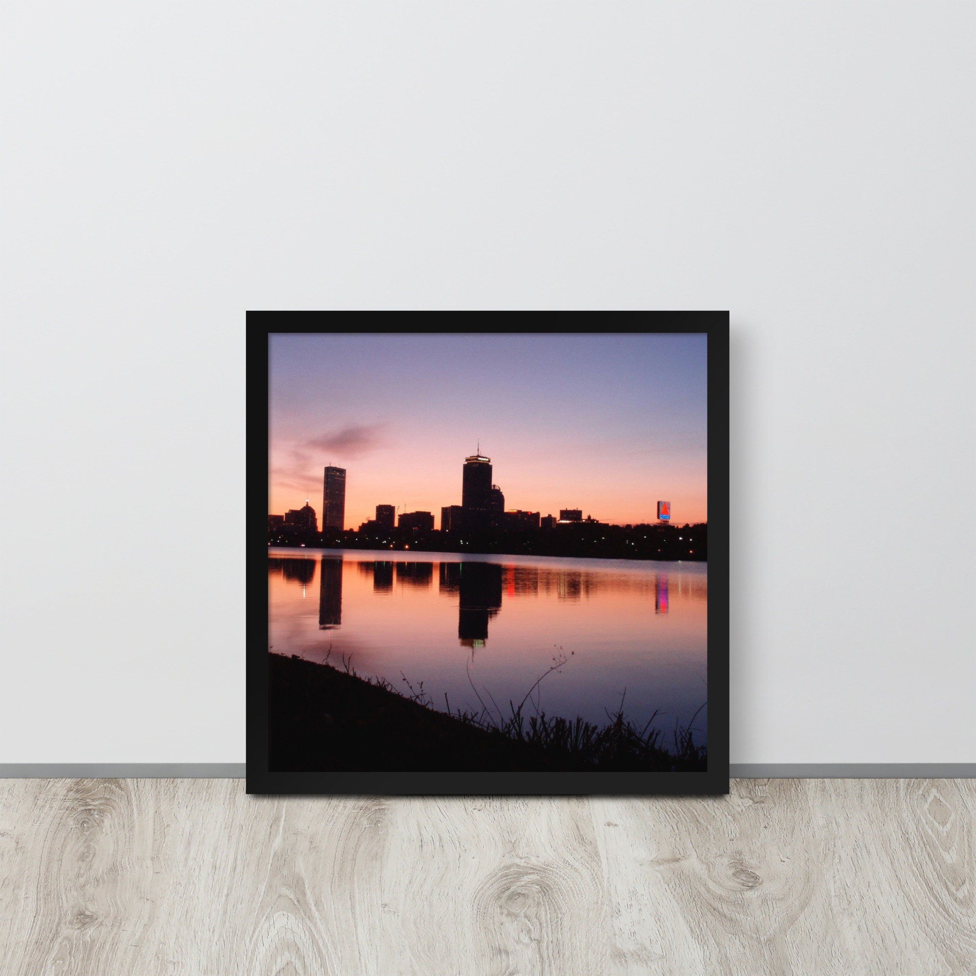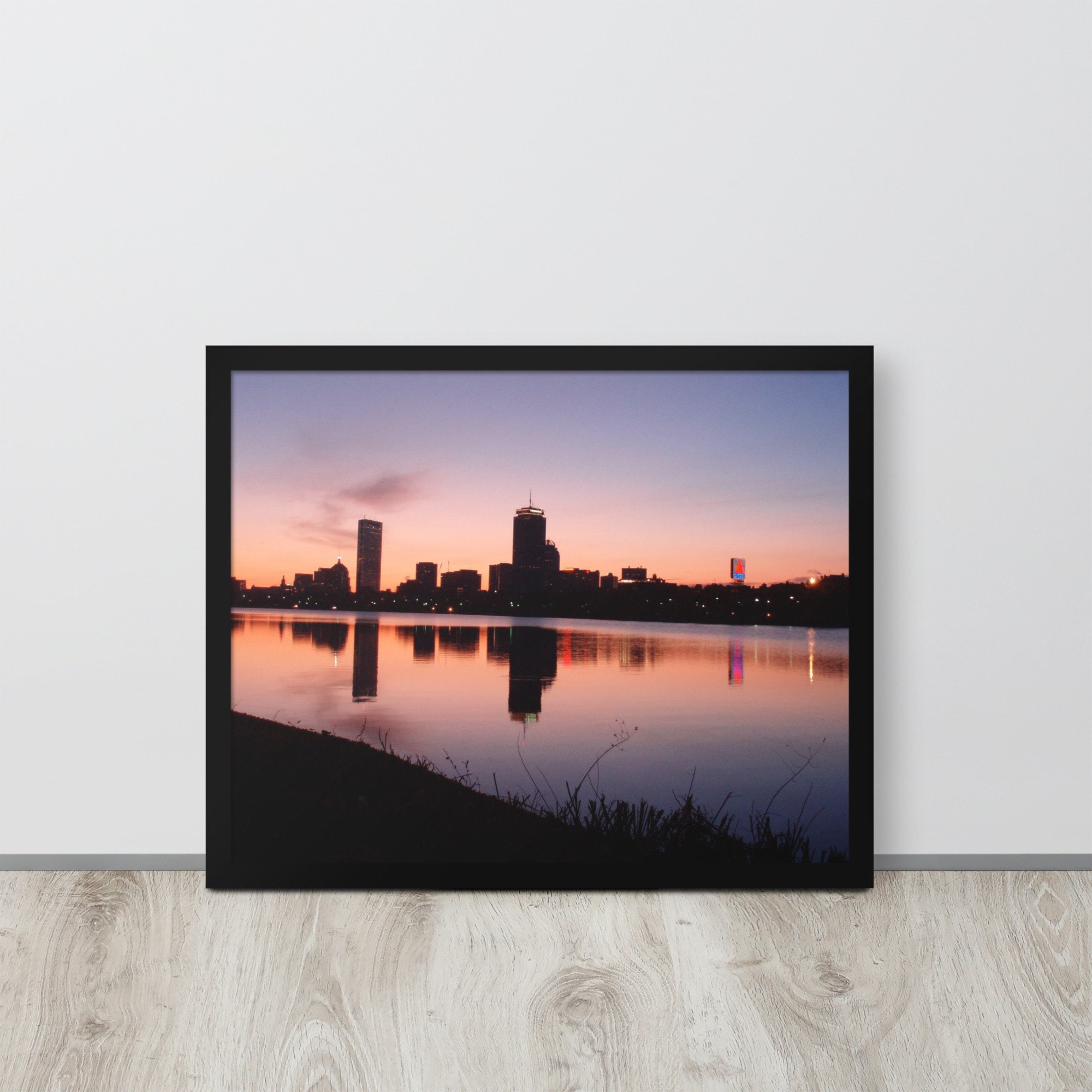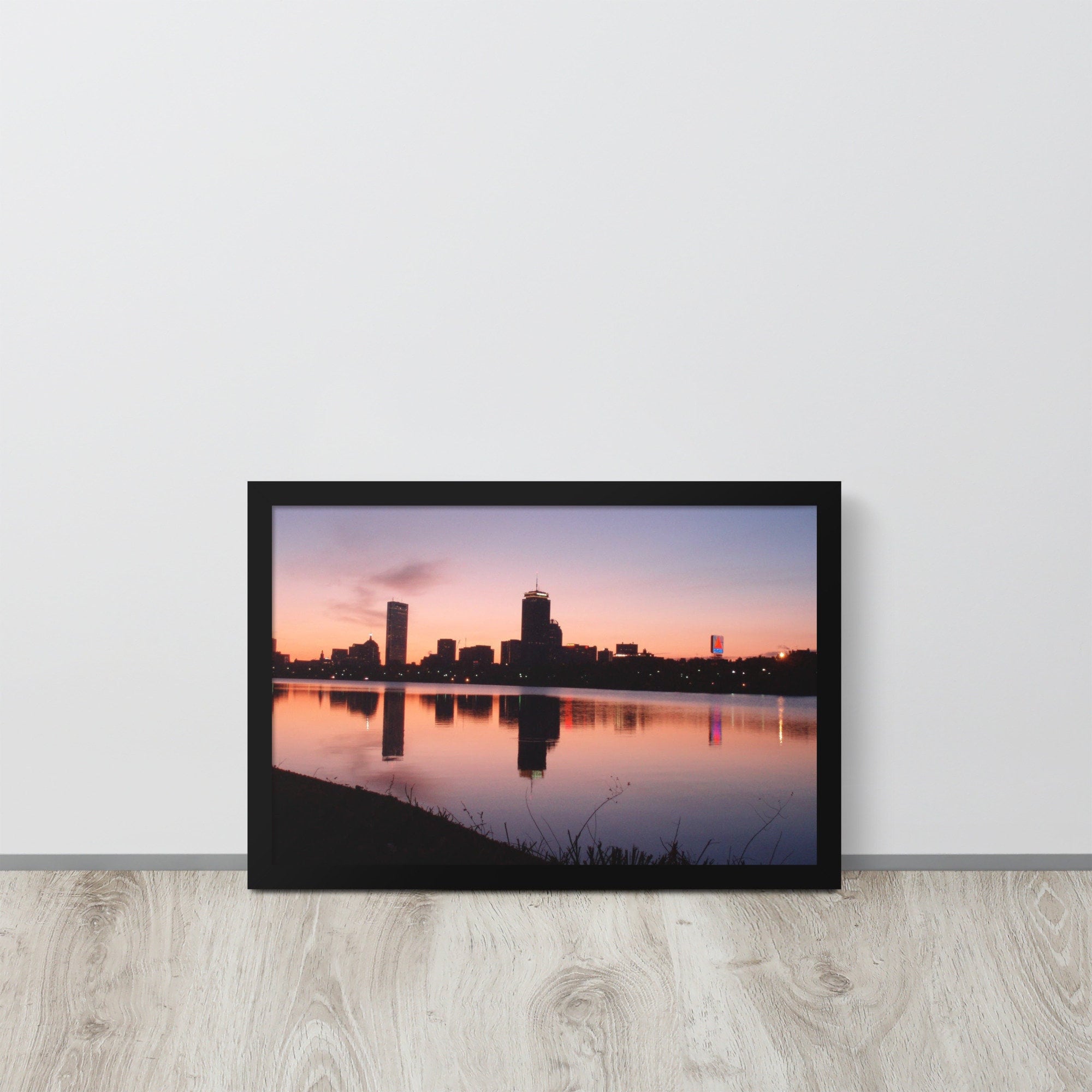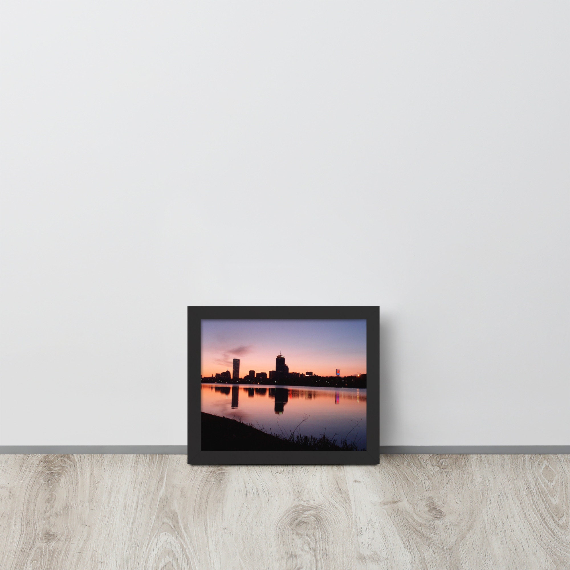 This photograph, taken from the shore of the Charles River in the early morning hours of a crisp fall day in 2006, features a silhouette of the Boston skyline (including the famous Citco sign) against a sky that shifts from the deep blue of night to the warm pinkish orange of dawn. The image is reflected perfectly upon the mirror-like Charles River.