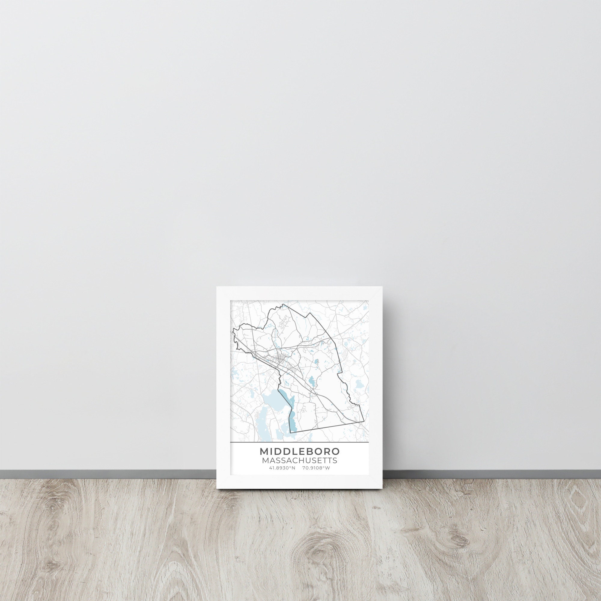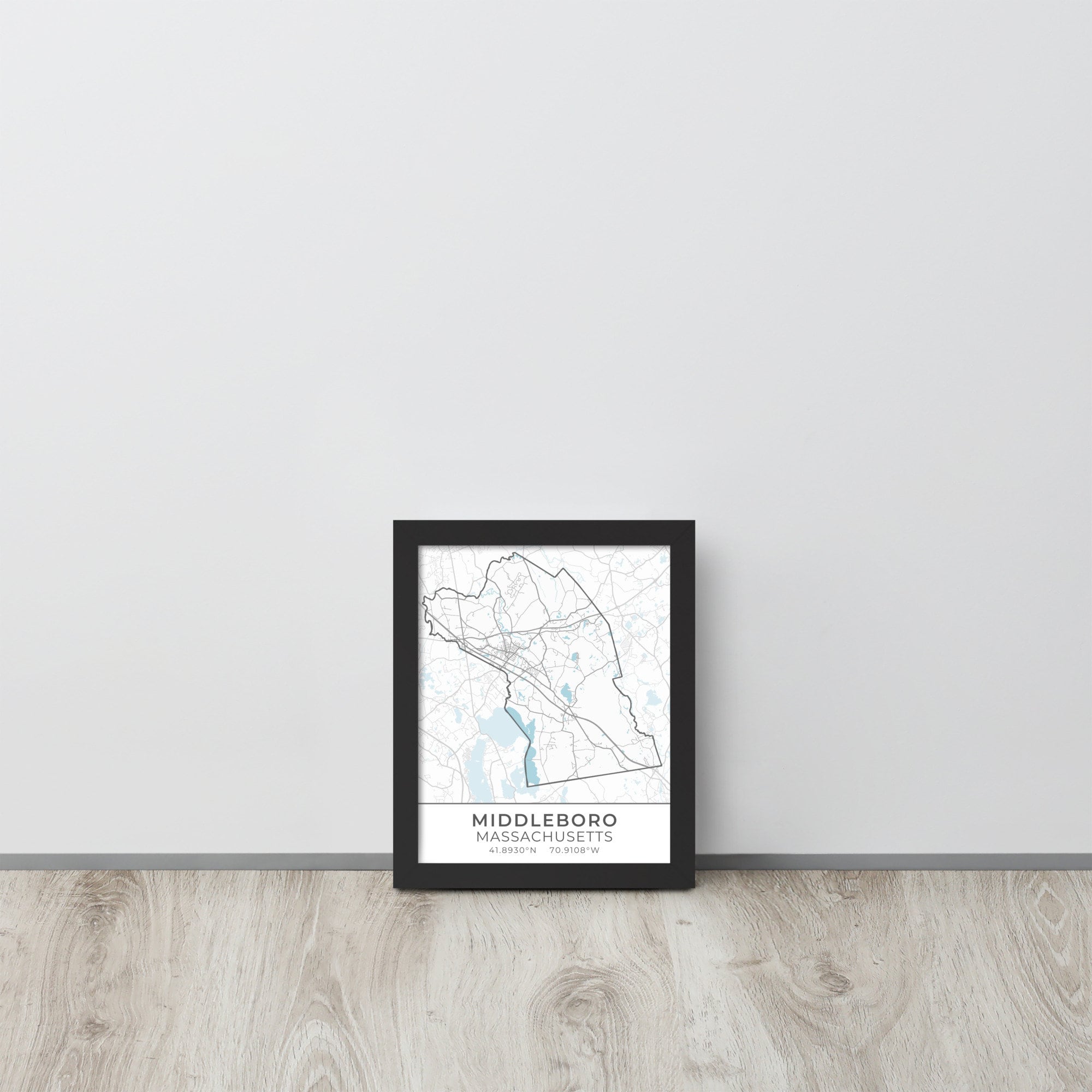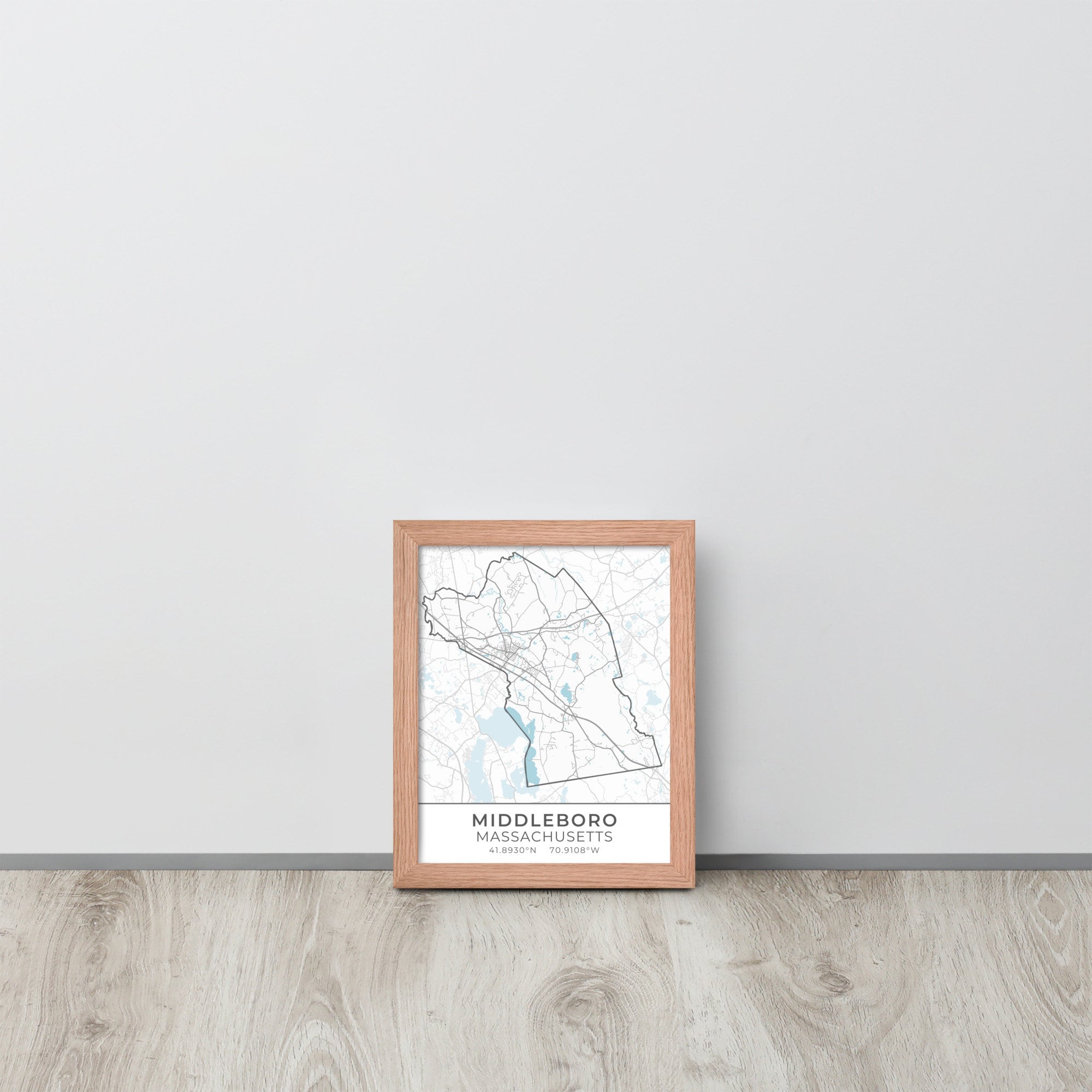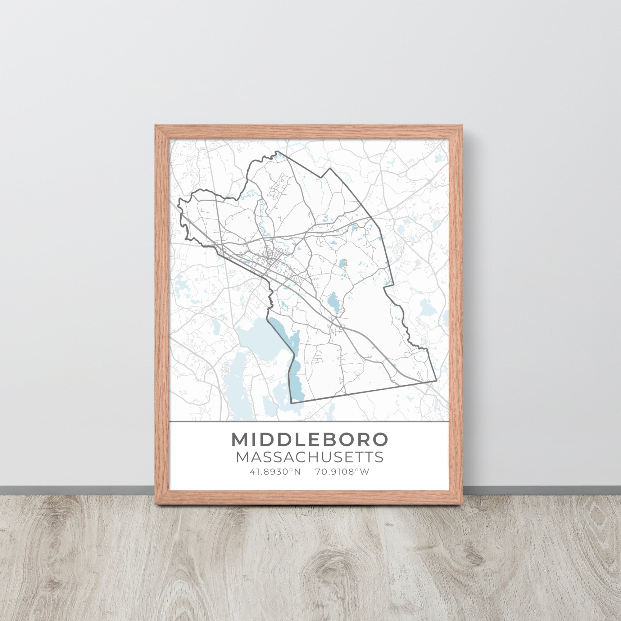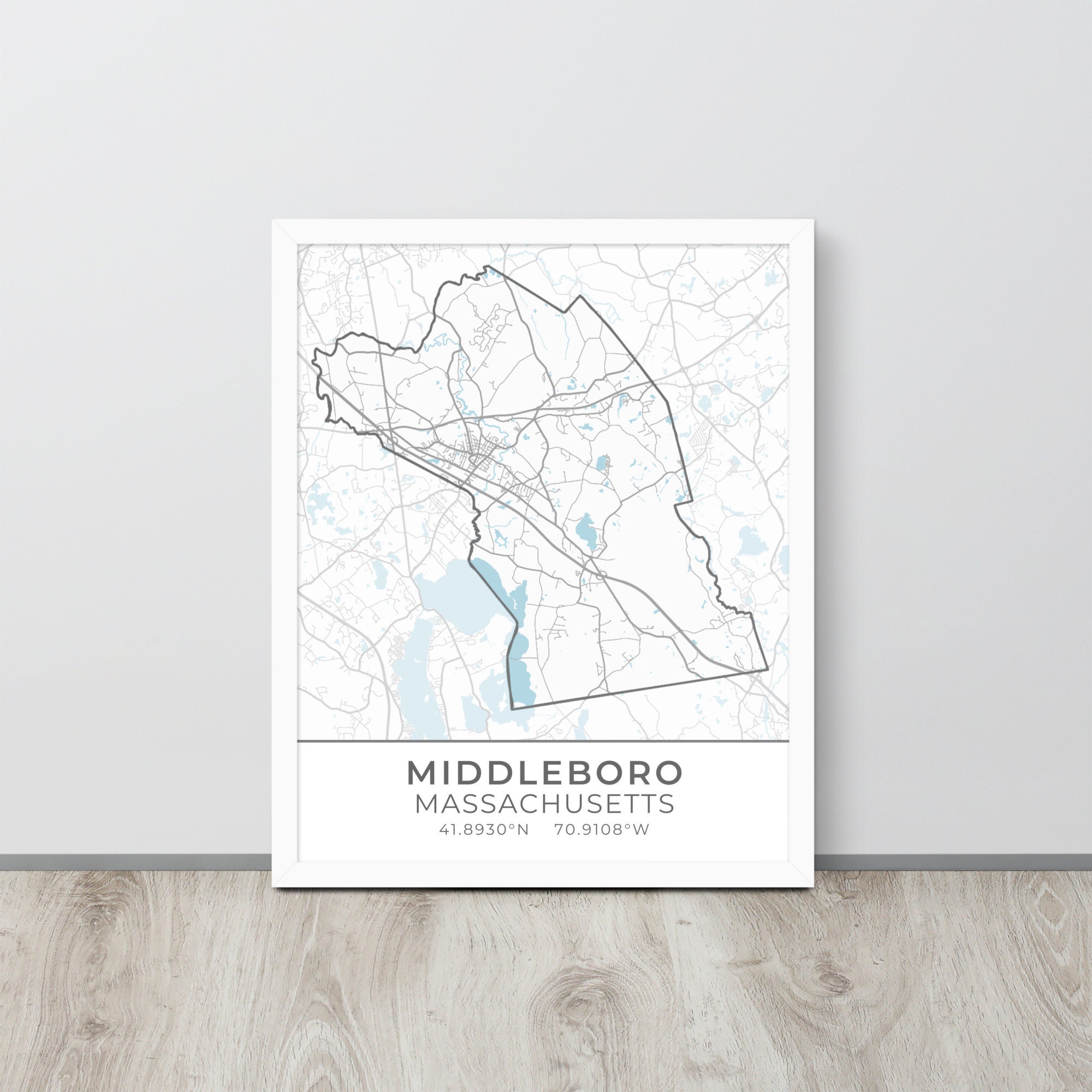 This artwork features a map of streets (light gray) and bodies of water (blue) located in Middleboro, Massachusetts, along with small sections of adjoining towns. Middleboro is outlined in dark gray. Beneath the map are the coordinates of the town.