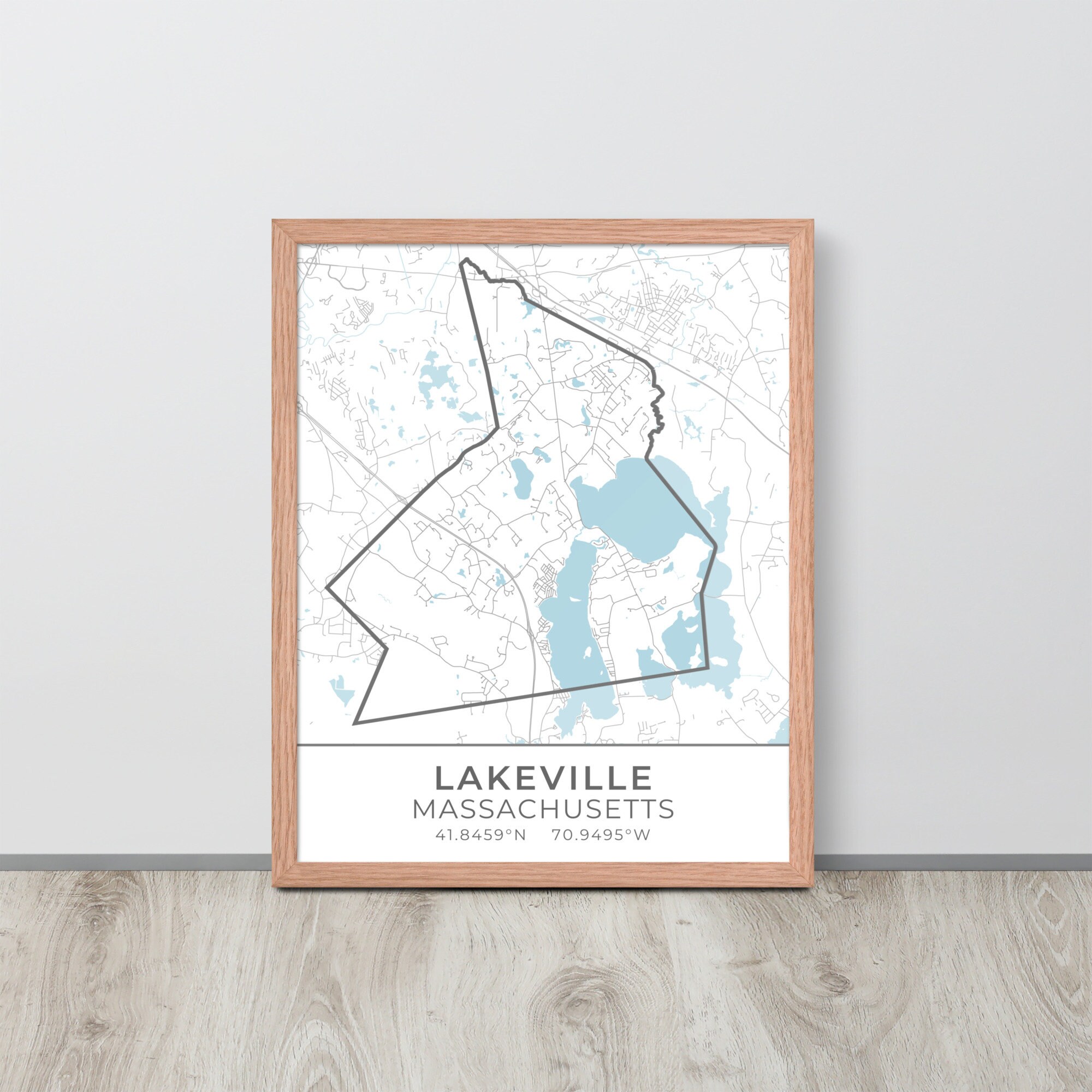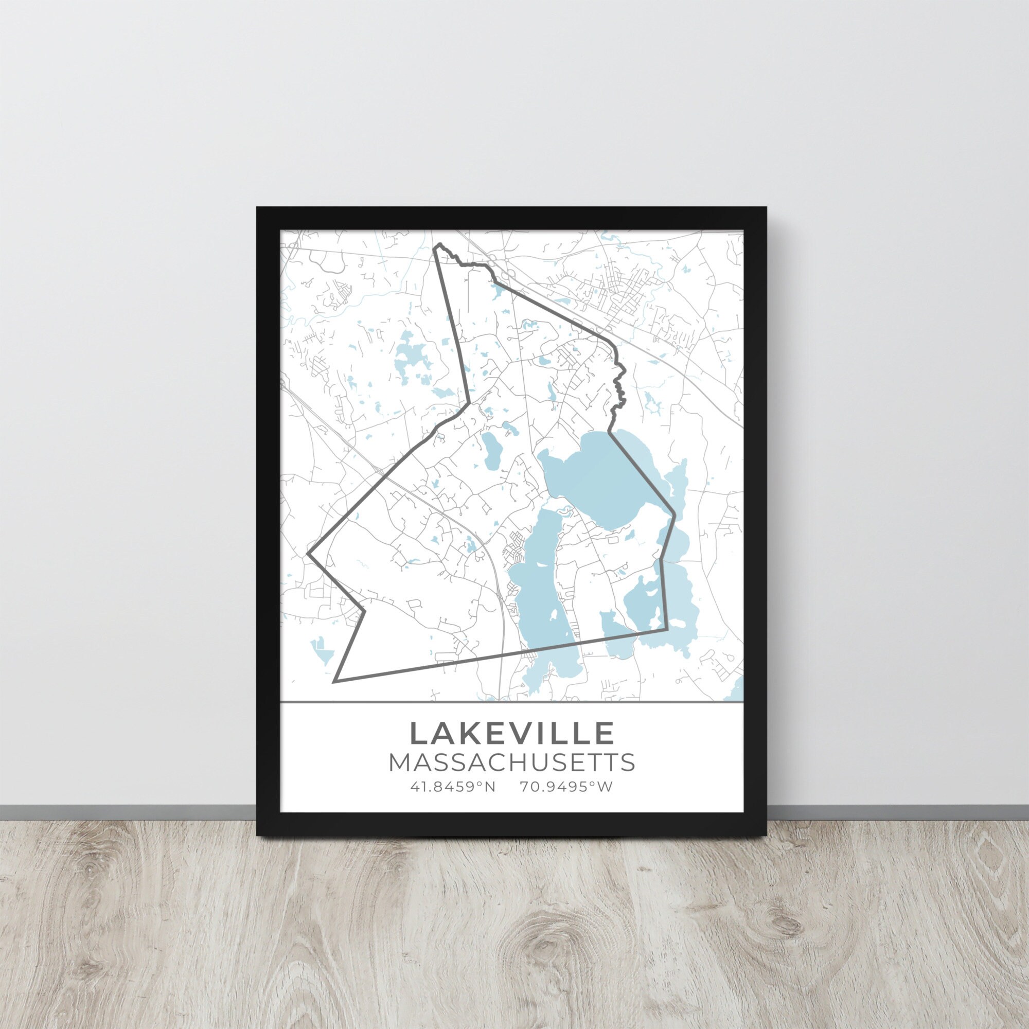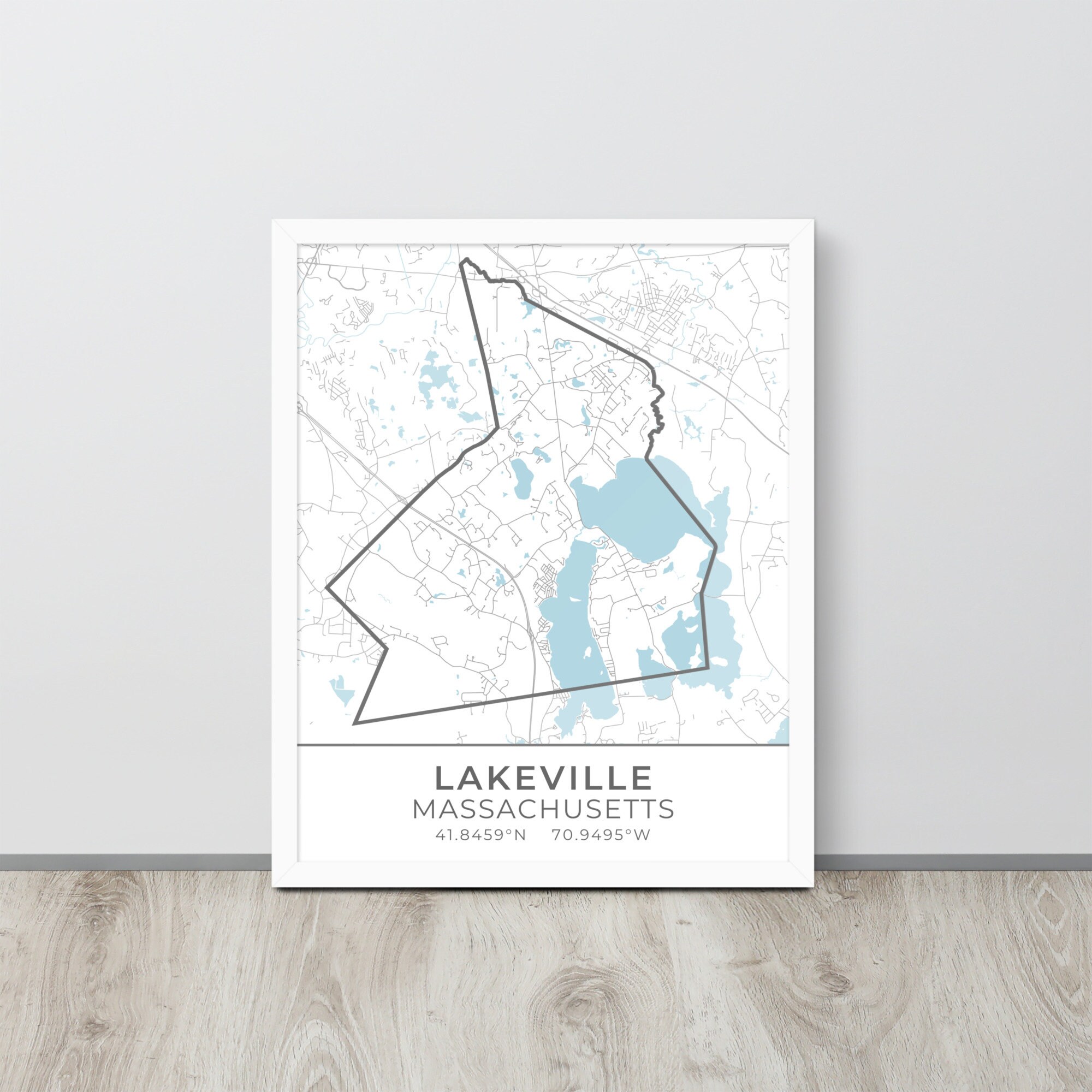 This artwork features a map of streets (light gray) and bodies of water (blue) located in Lakeville, Massachusetts, along with small sections of adjoining towns. Lakeville is outlined in dark gray. Beneath the map are the coordinates of the town.