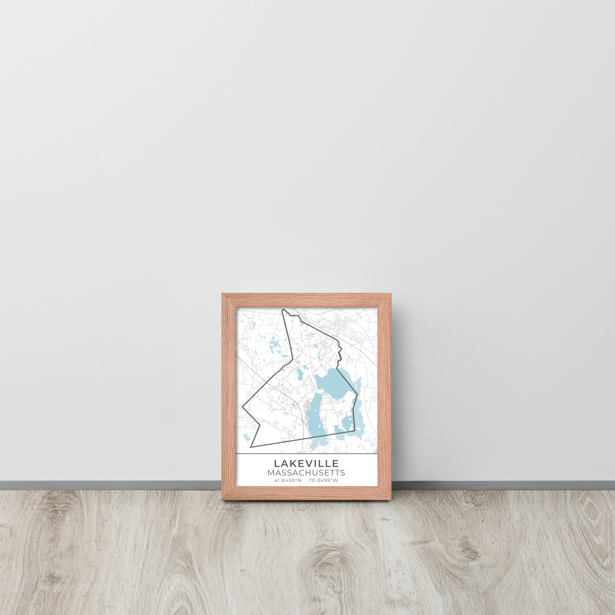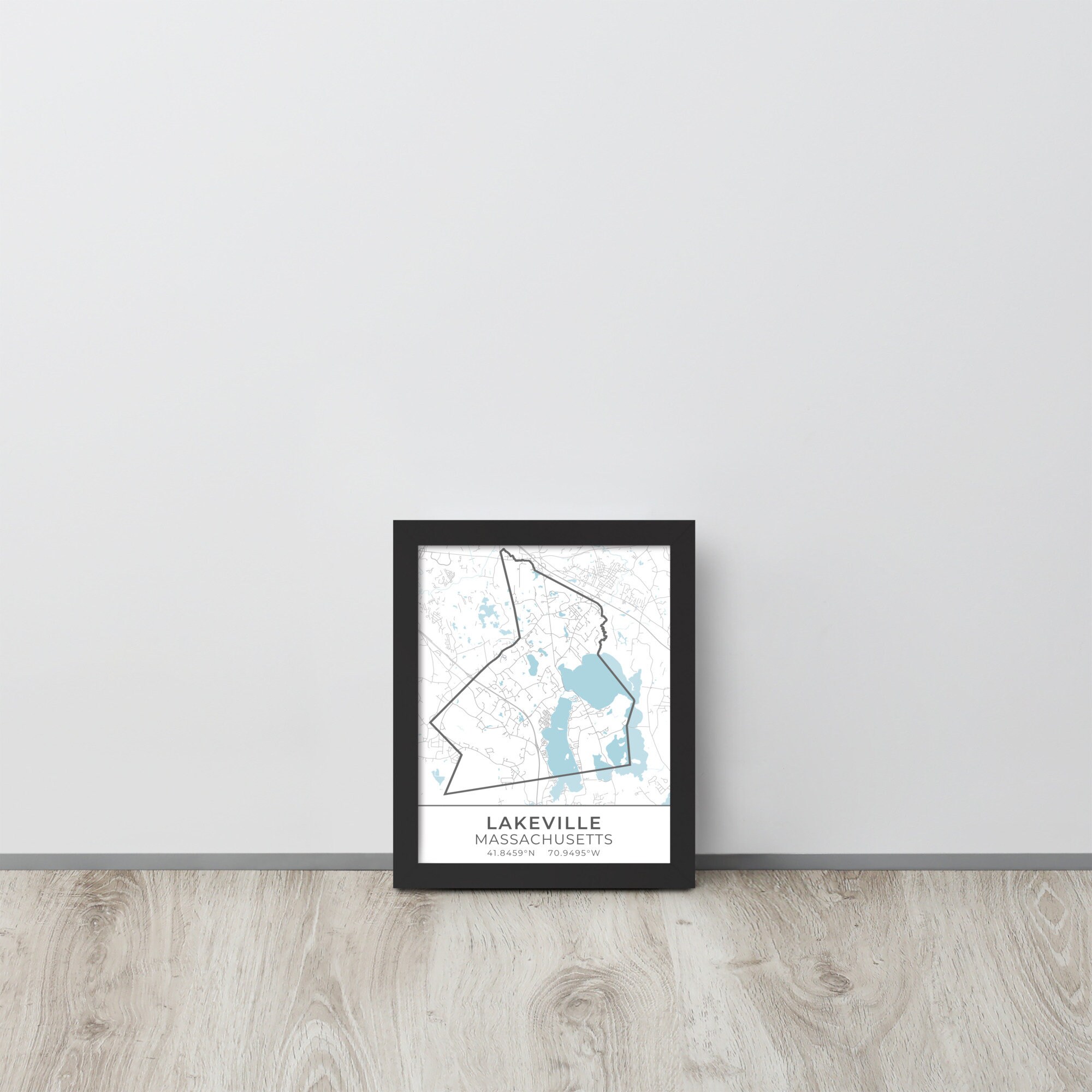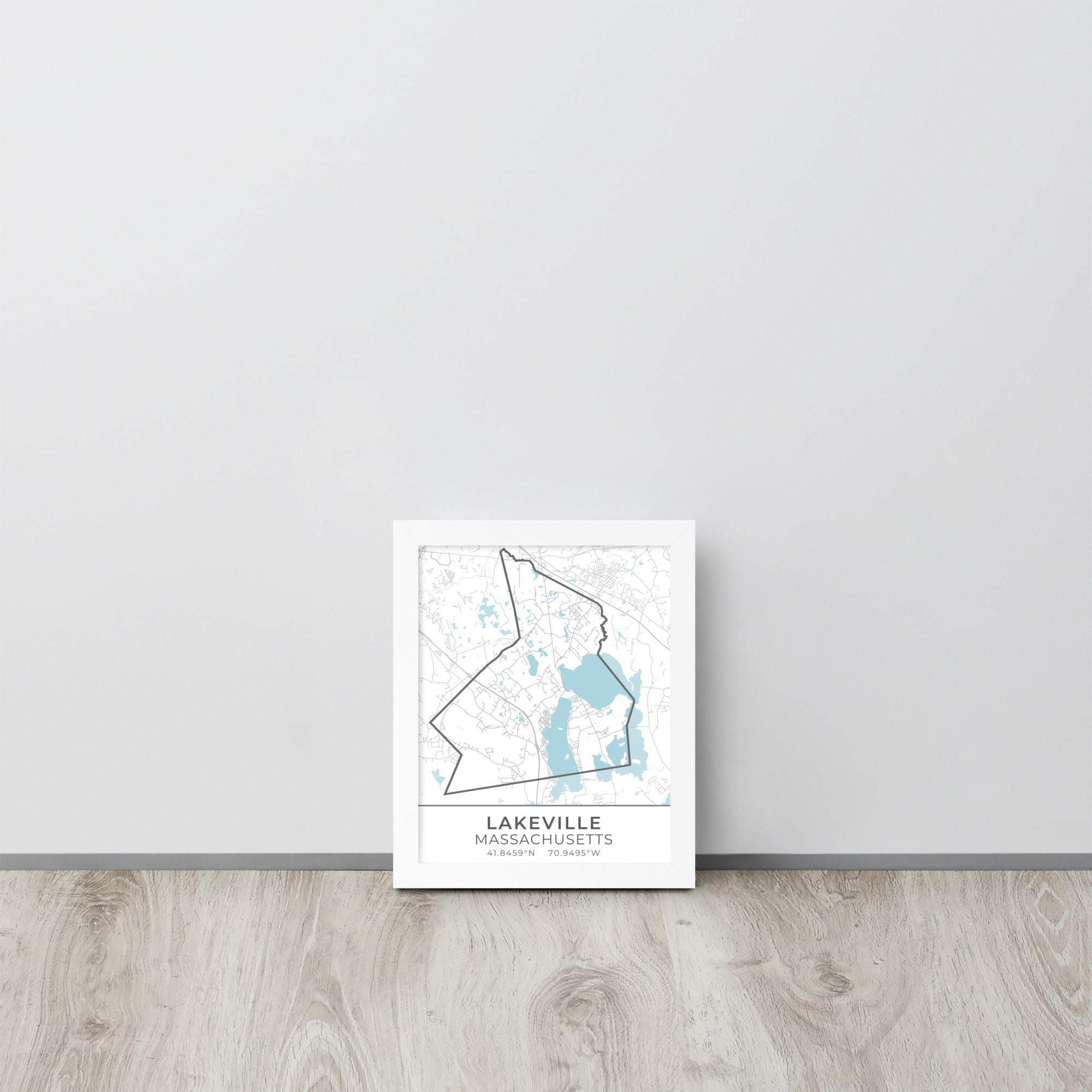 This artwork features a map of streets (light gray) and bodies of water (blue) located in Lakeville, Massachusetts, along with small sections of adjoining towns. Lakeville is outlined in dark gray. Beneath the map are the coordinates of the town.