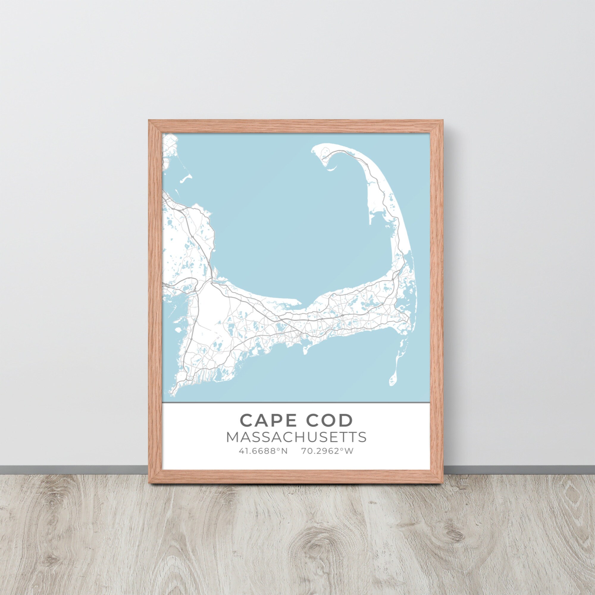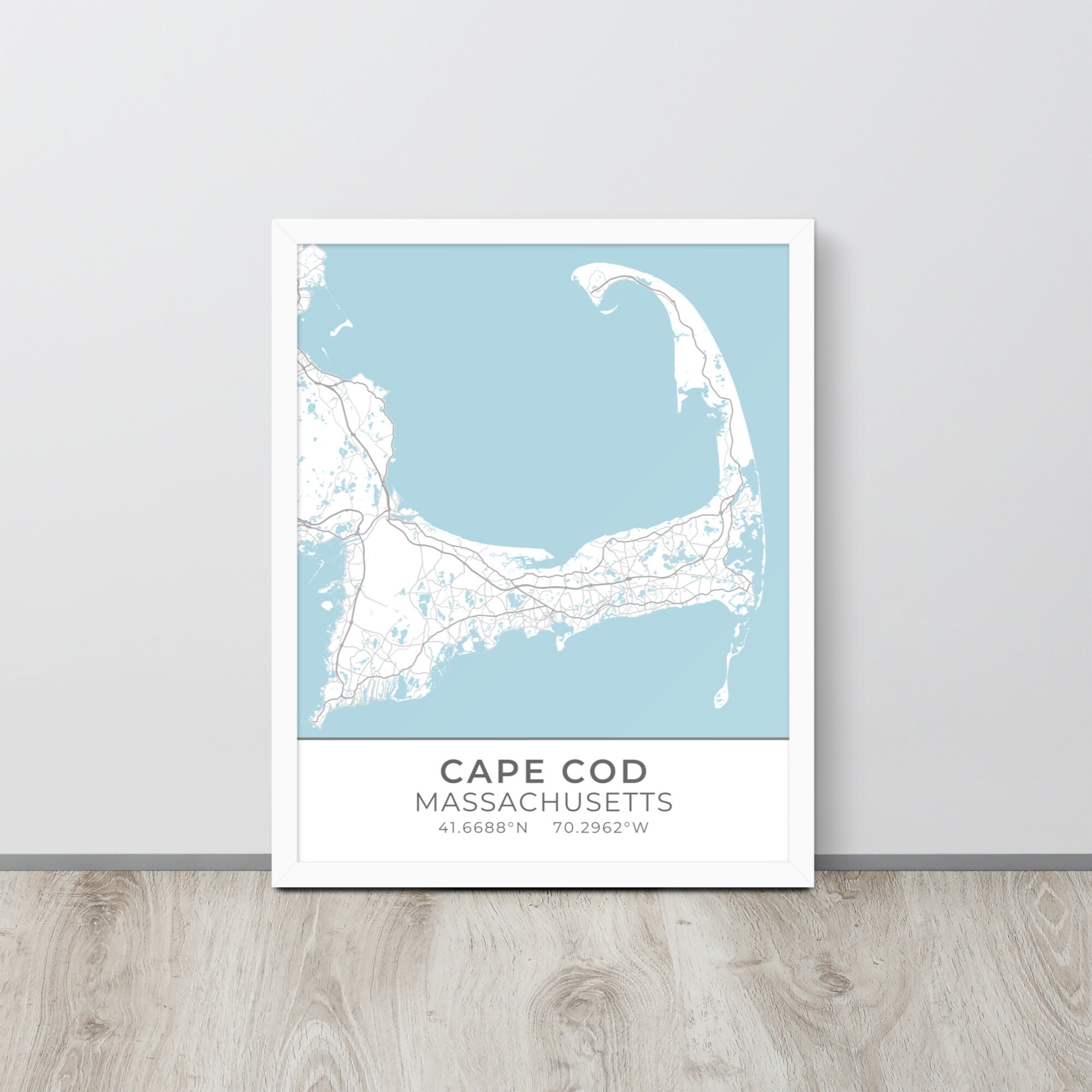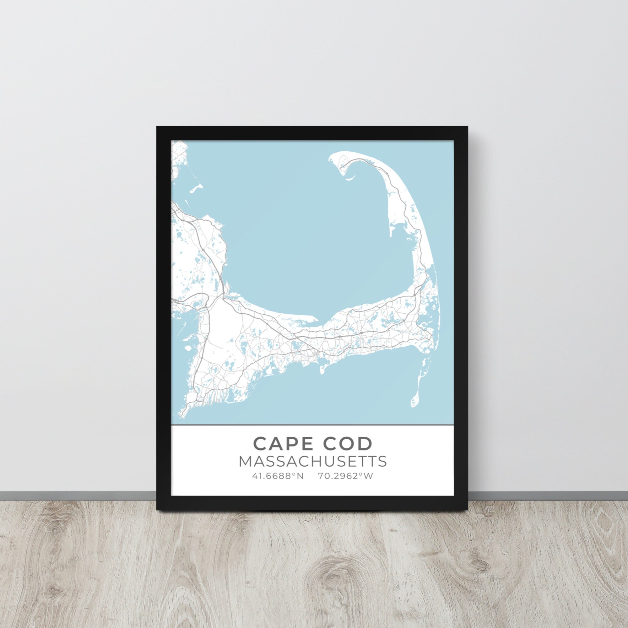 This artwork features a map of streets (light gray) and bodies of water (blue) located in and around Cape Cod, Massachusetts, along with small sections of adjoining towns. Beneath the map are the coordinates of the Cape.