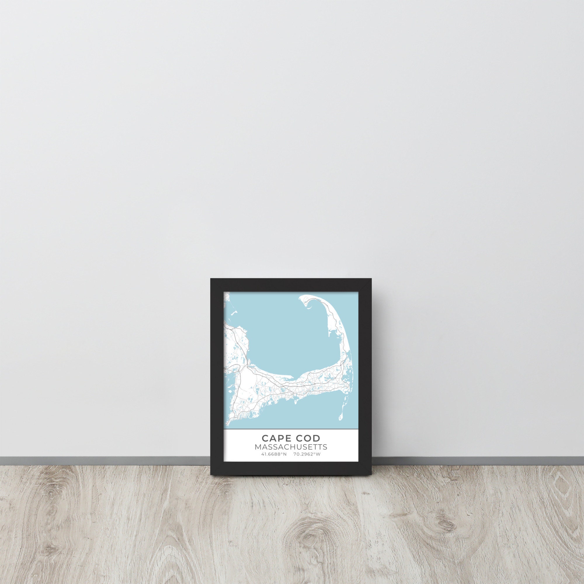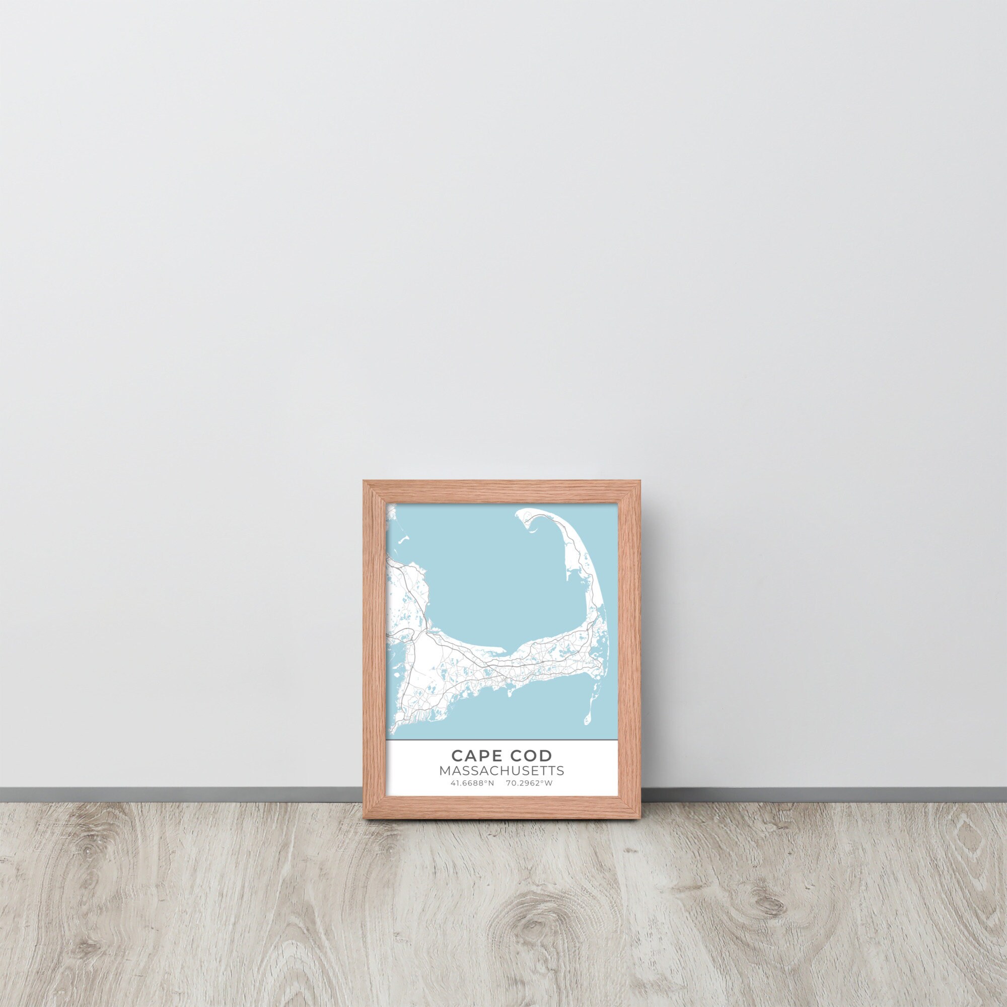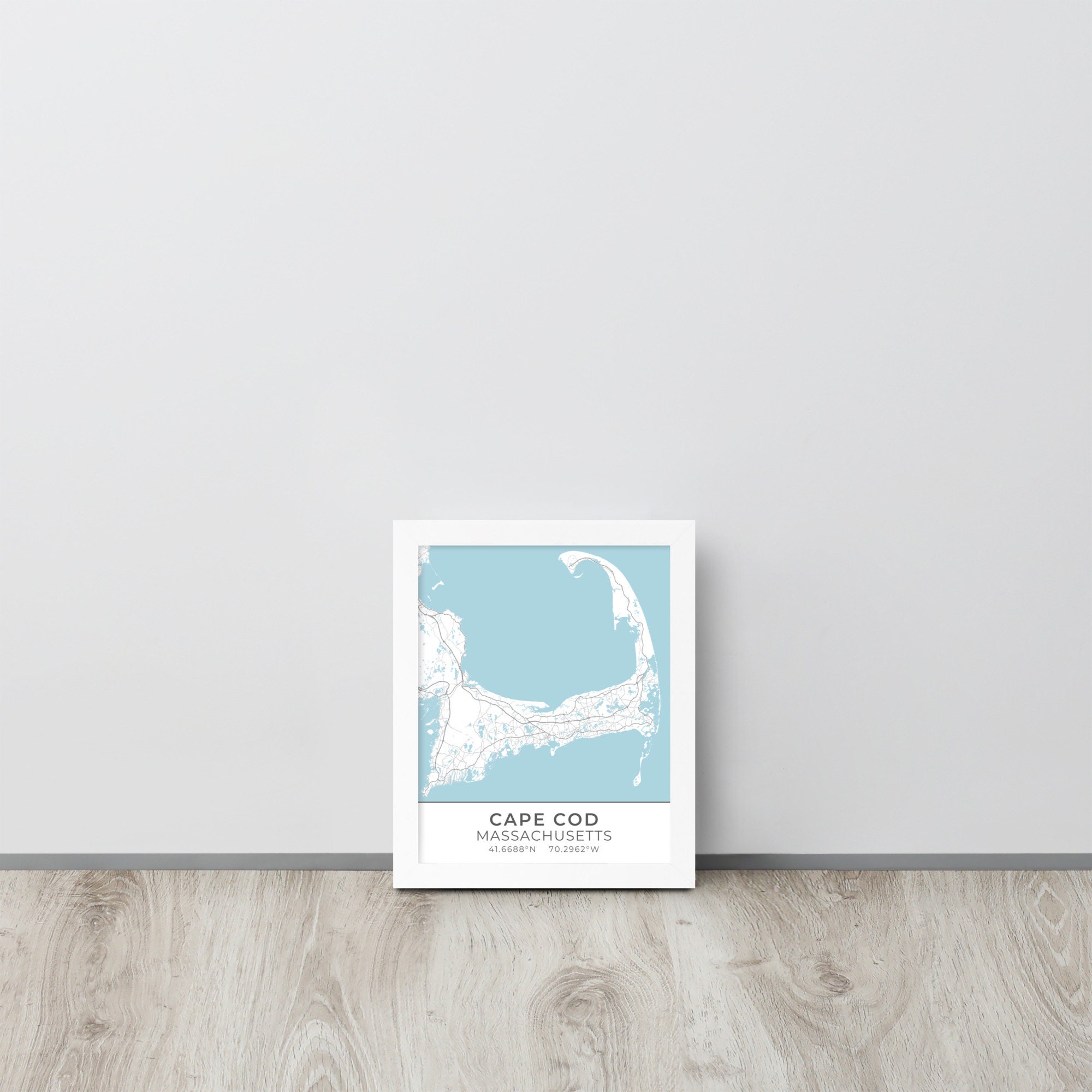 This artwork features a map of streets (light gray) and bodies of water (blue) located in and around Cape Cod, Massachusetts, along with small sections of adjoining towns. Beneath the map are the coordinates of the Cape.