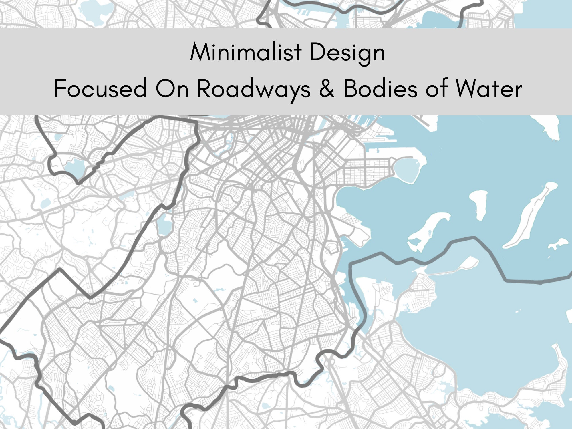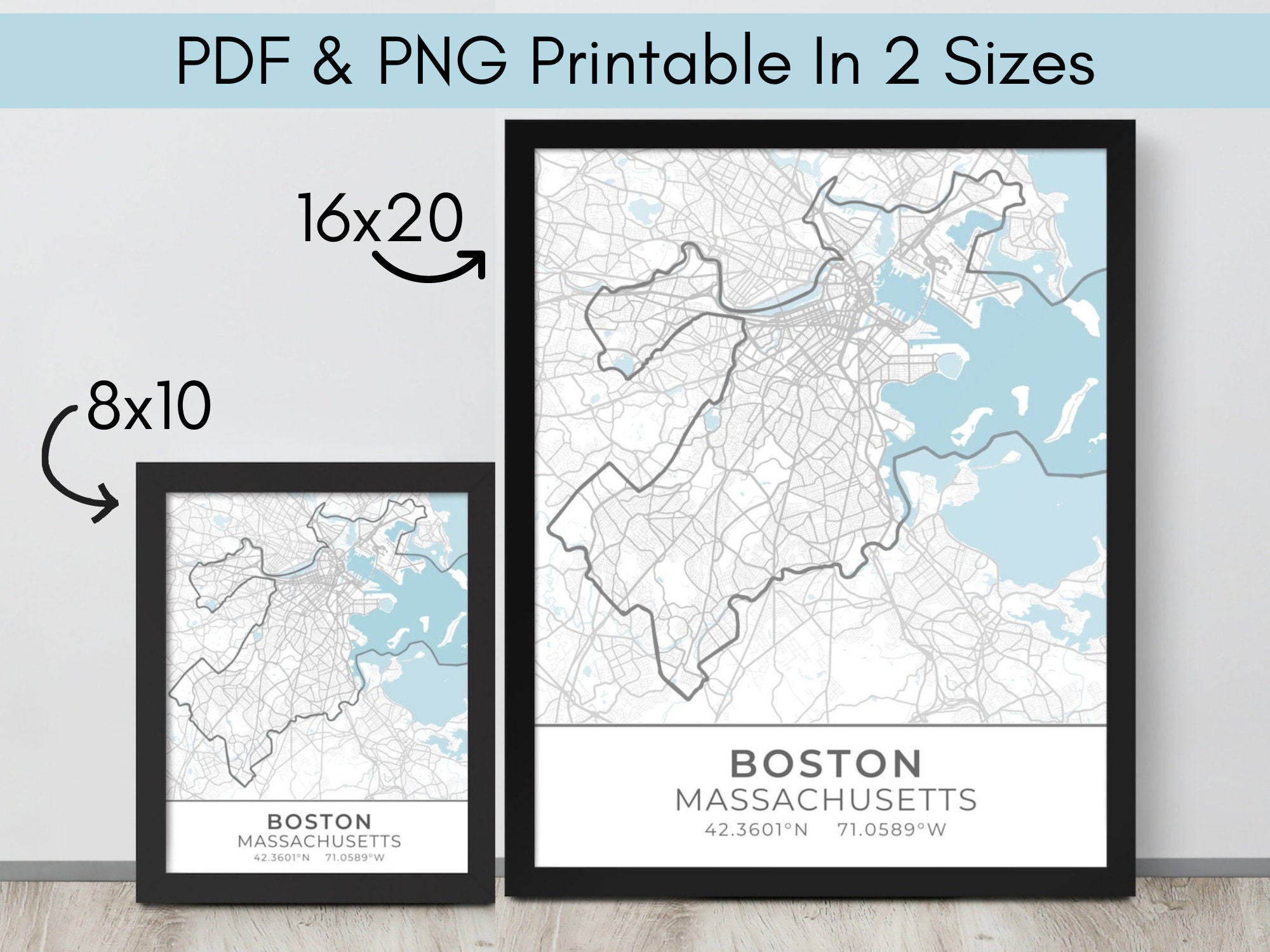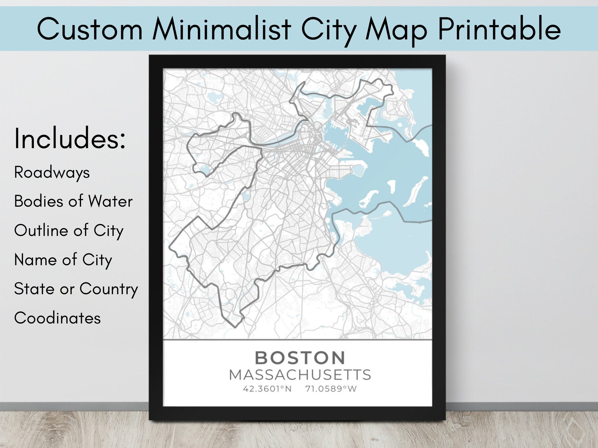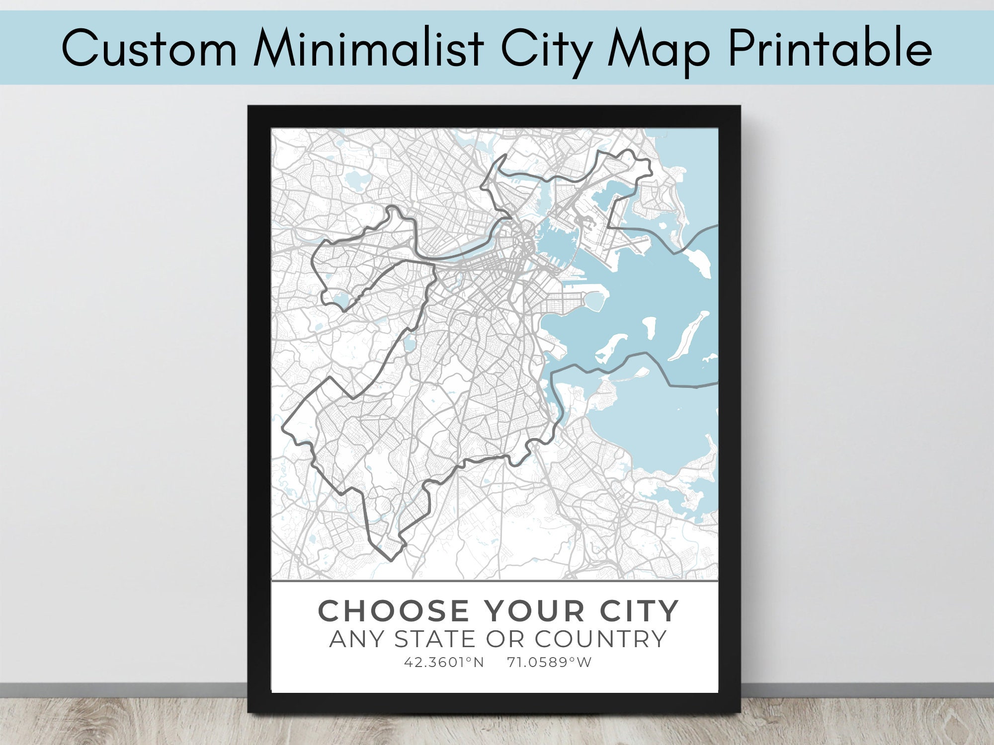 This artwork features a map of streets (light gray) and bodies of water (light blue) located in the city of your choice, along with small sections of adjoining towns. Your city is outlined in dark gray. Beneath the map are the coordinates of the city.